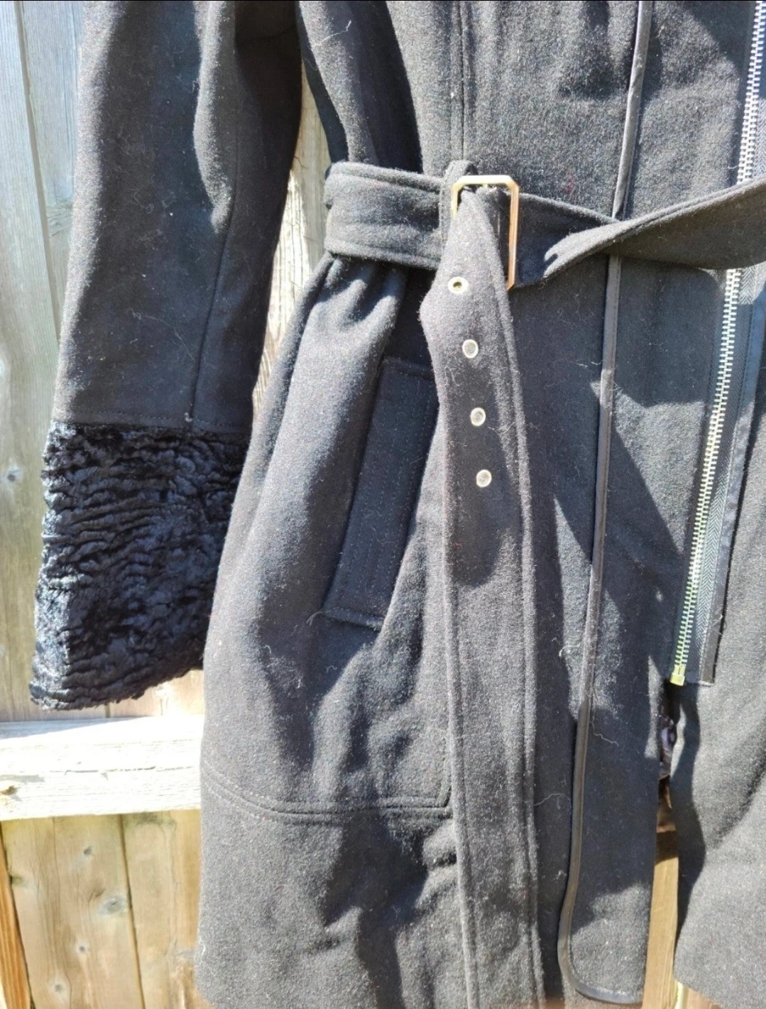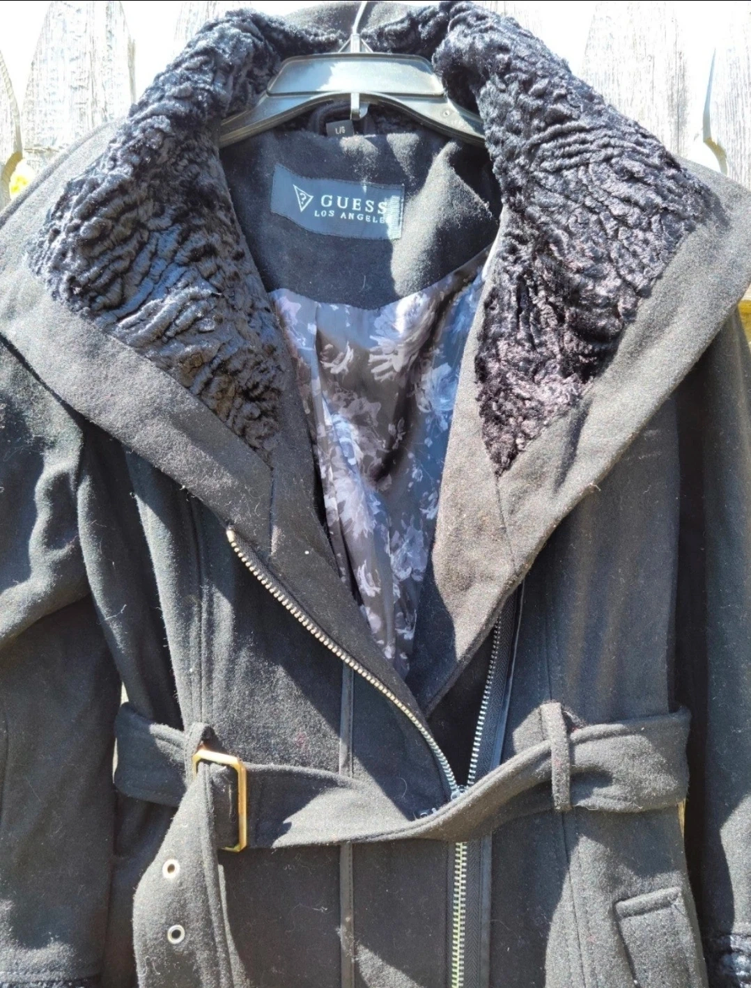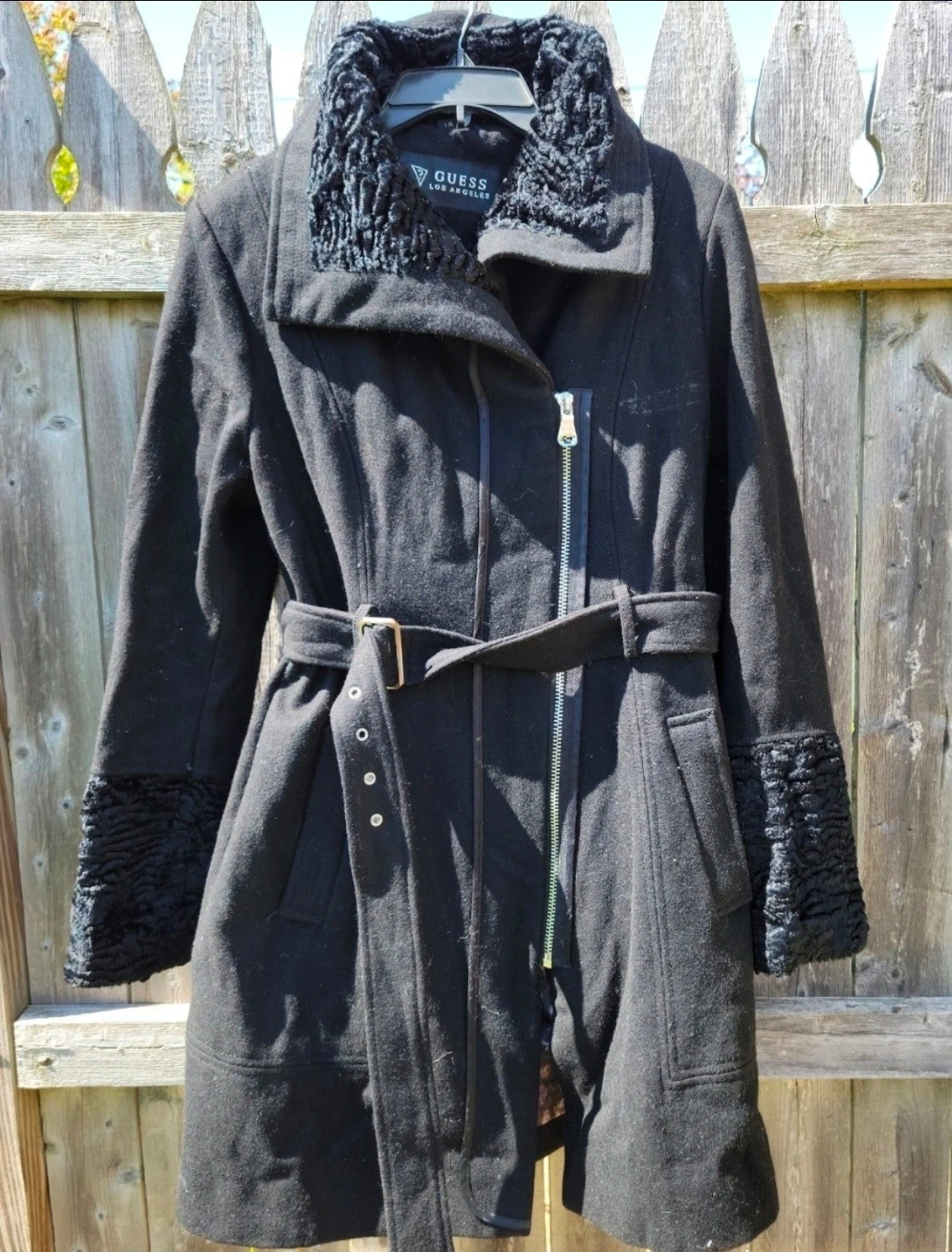 Selling a Guess Los Angeles black coat. It features a belted waist and faux fur trim on the collar and cuffs. This coat is perfect for staying warm and stylish!