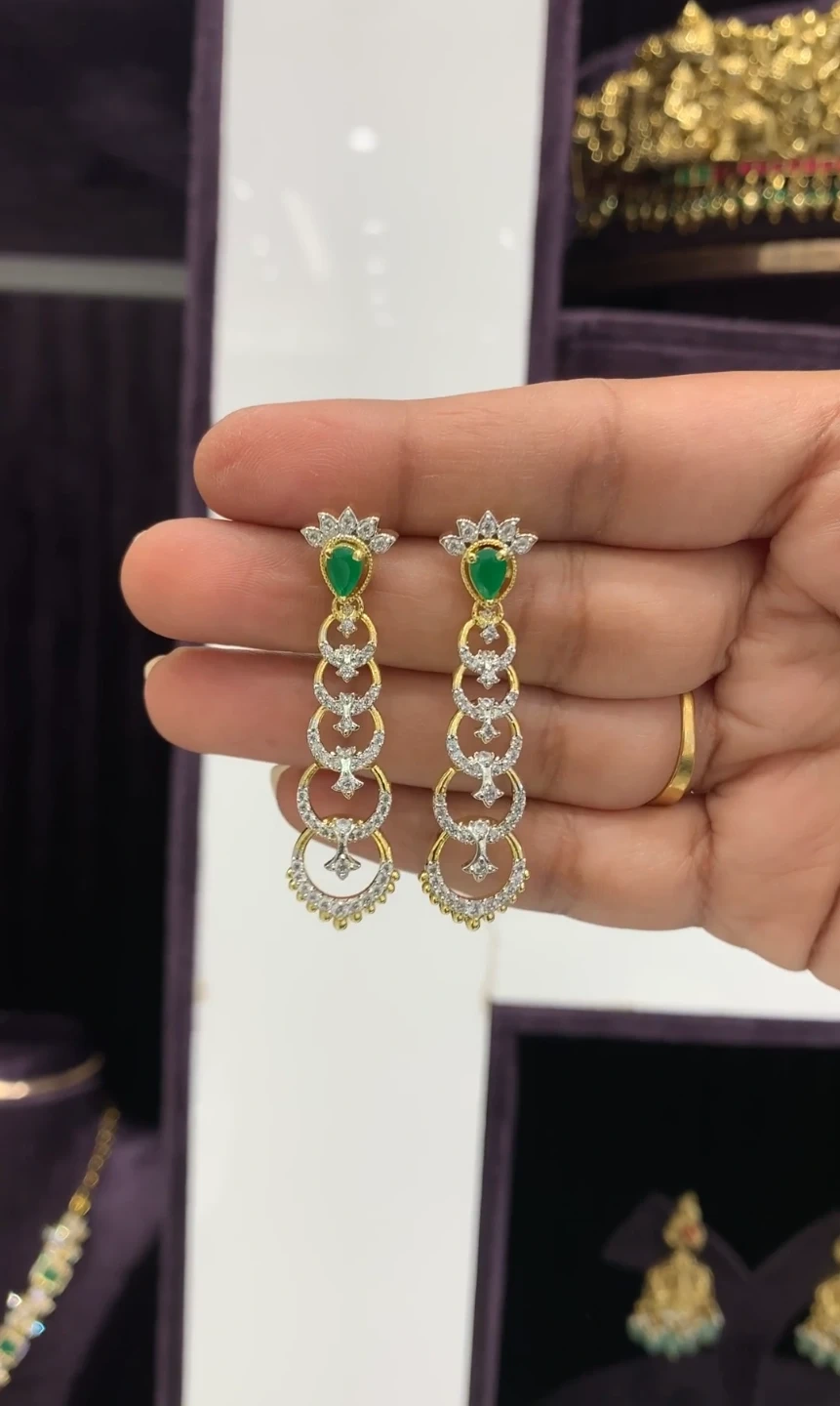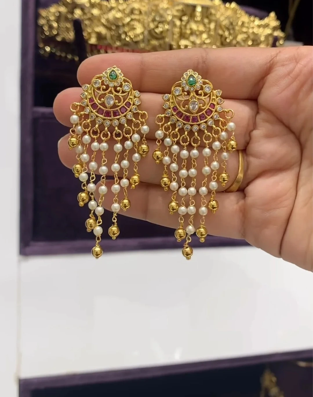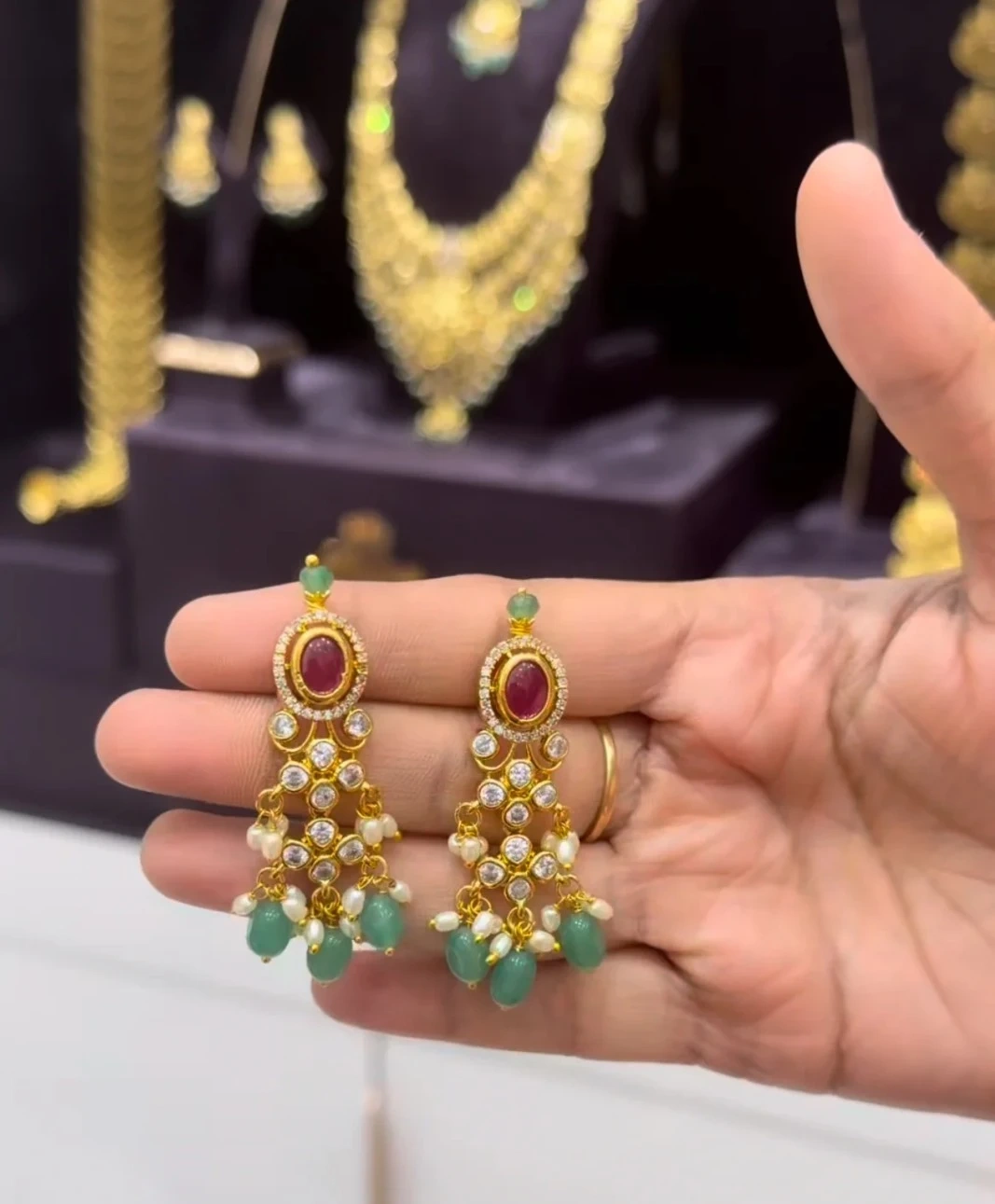Stunning gold earrings adorned with vibrant emeralds and classic pearls. These elegant dangly earrings feature intricate detailing and a beautiful chandelier design. They're perfect for adding a touch of sophistication to any outfit!
