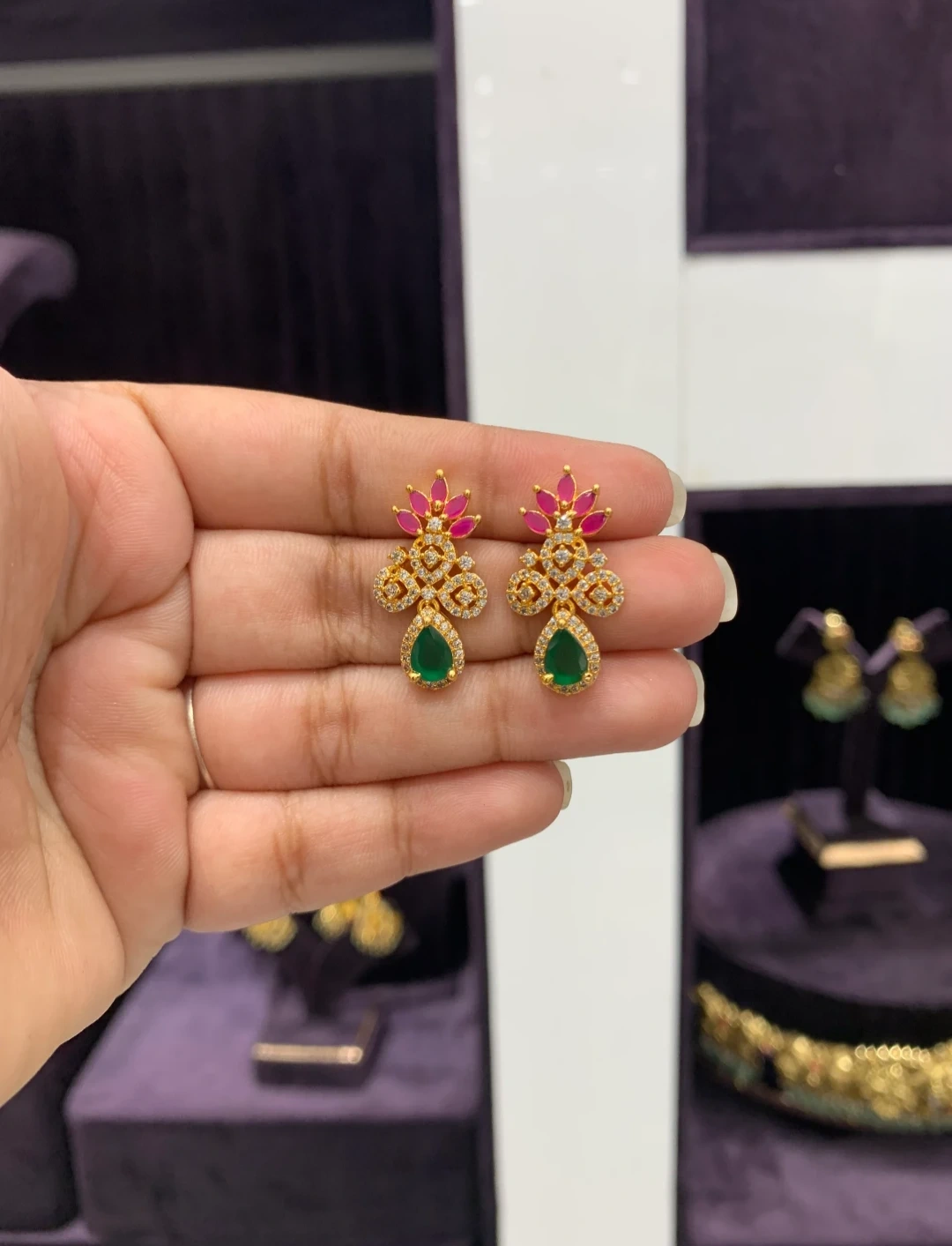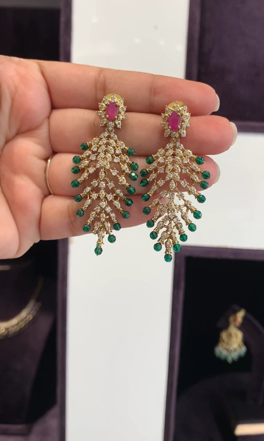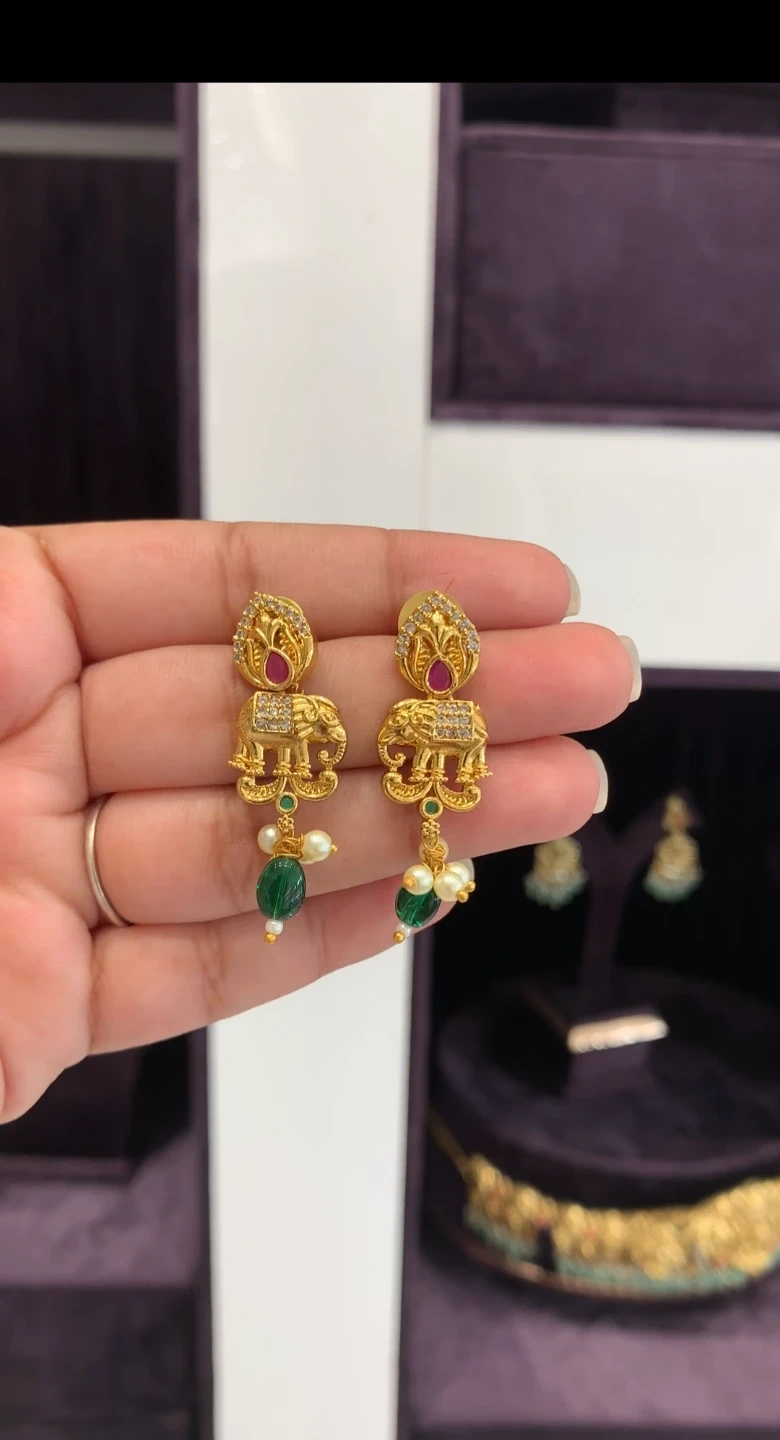 Stunning gold earrings adorned with vibrant emeralds and classic pearls. These elegant dangly earrings feature intricate detailing and a beautiful chandelier design. They're perfect for adding a touch of sophistication to any outfit!
