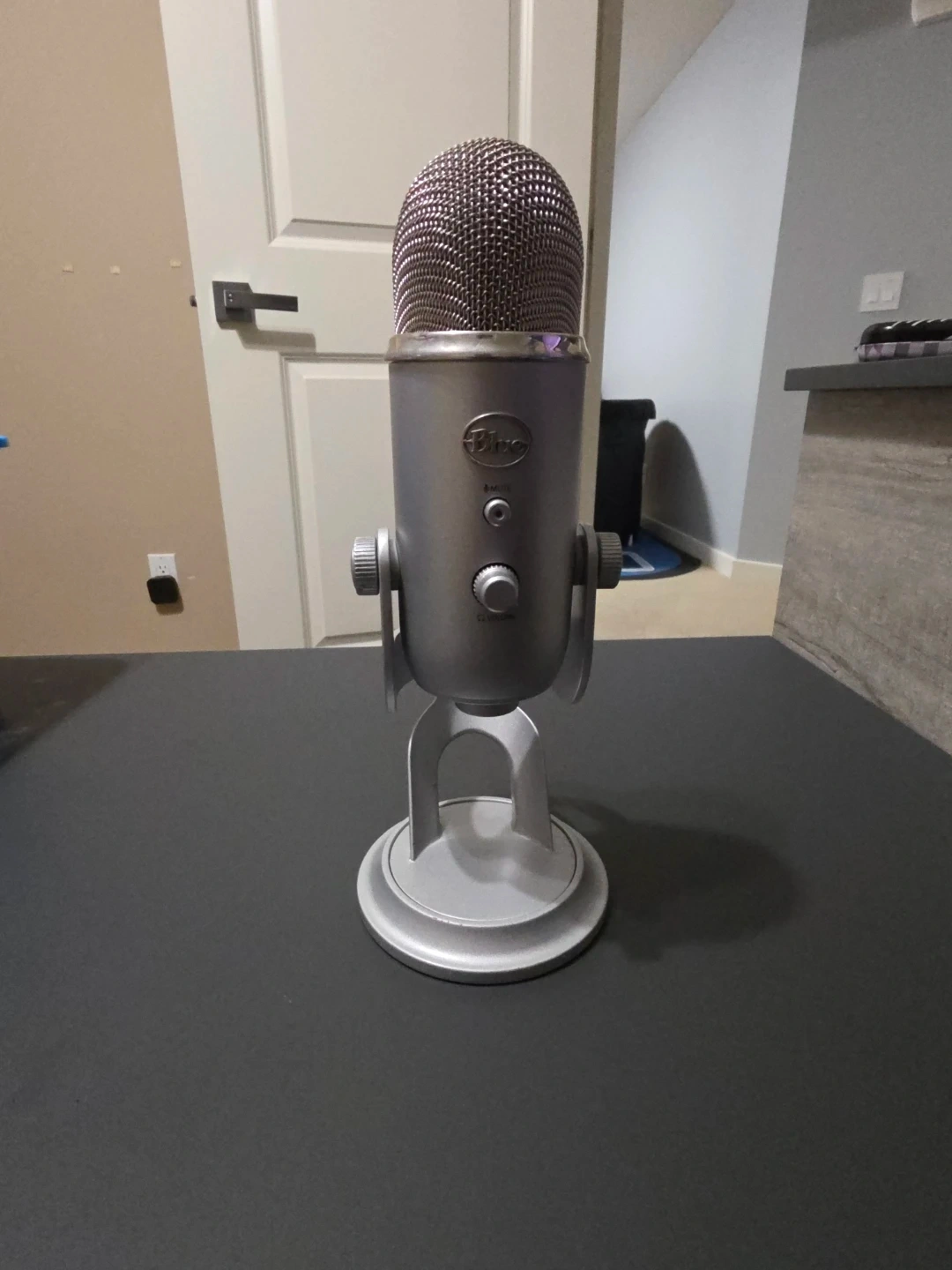 This is a Blue Yeti USB microphone in silver. It comes with a USB cable for easy plug-and-play connectivity. This mic is great for streaming, podcasting, or recording voiceovers.