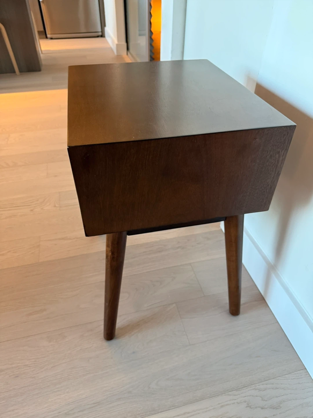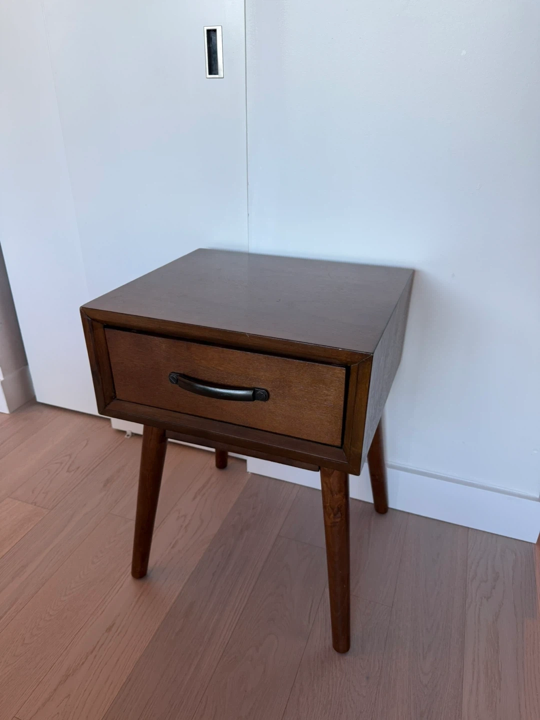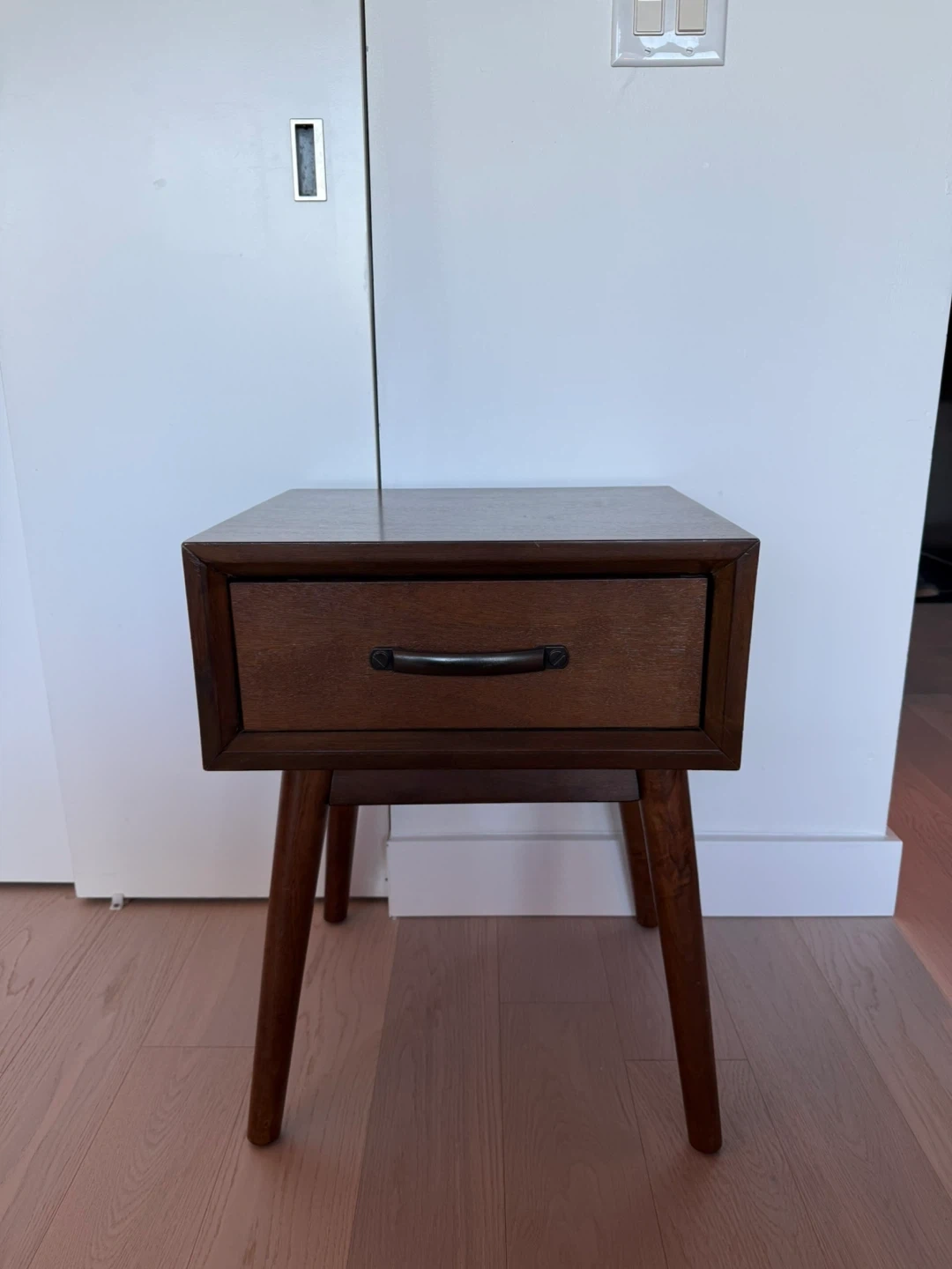 Selling a mid-century style wooden nightstand in great condition. The piece is solid, sturdy, and has been well cared for.