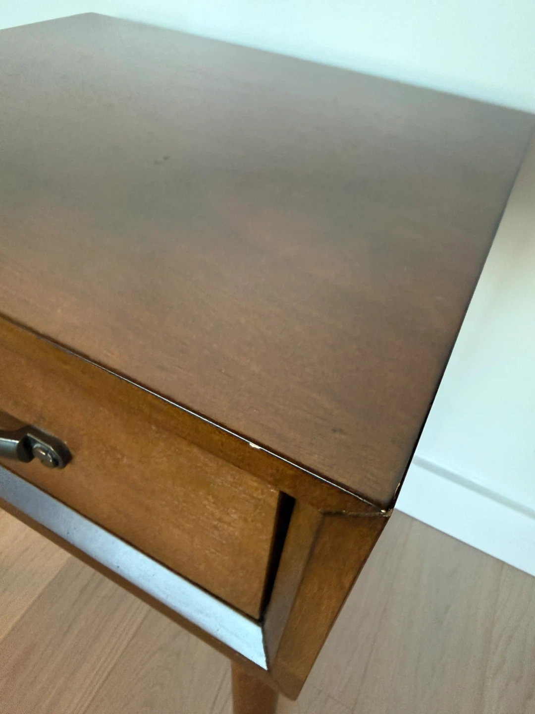 Cosmetically, it’s in great shape with a rich walnut-tone finish. The drawer opens and closes smoothly, and the tapered legs give it a classic mid-century modern look. There is one tiny blemish as pictured, but it’s minor and doesn’t affect the look or function of the piece.