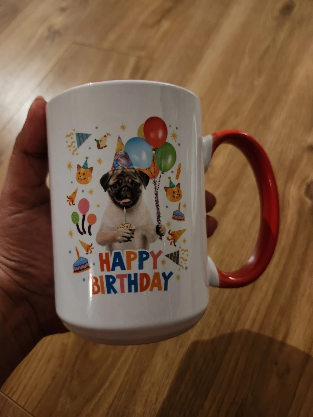 Pick up 280 Donlands Avenue. White ceramic mug with a 'Happy Birthday' pug design. Features a red handle and interior. A fun mug for birthdays!
