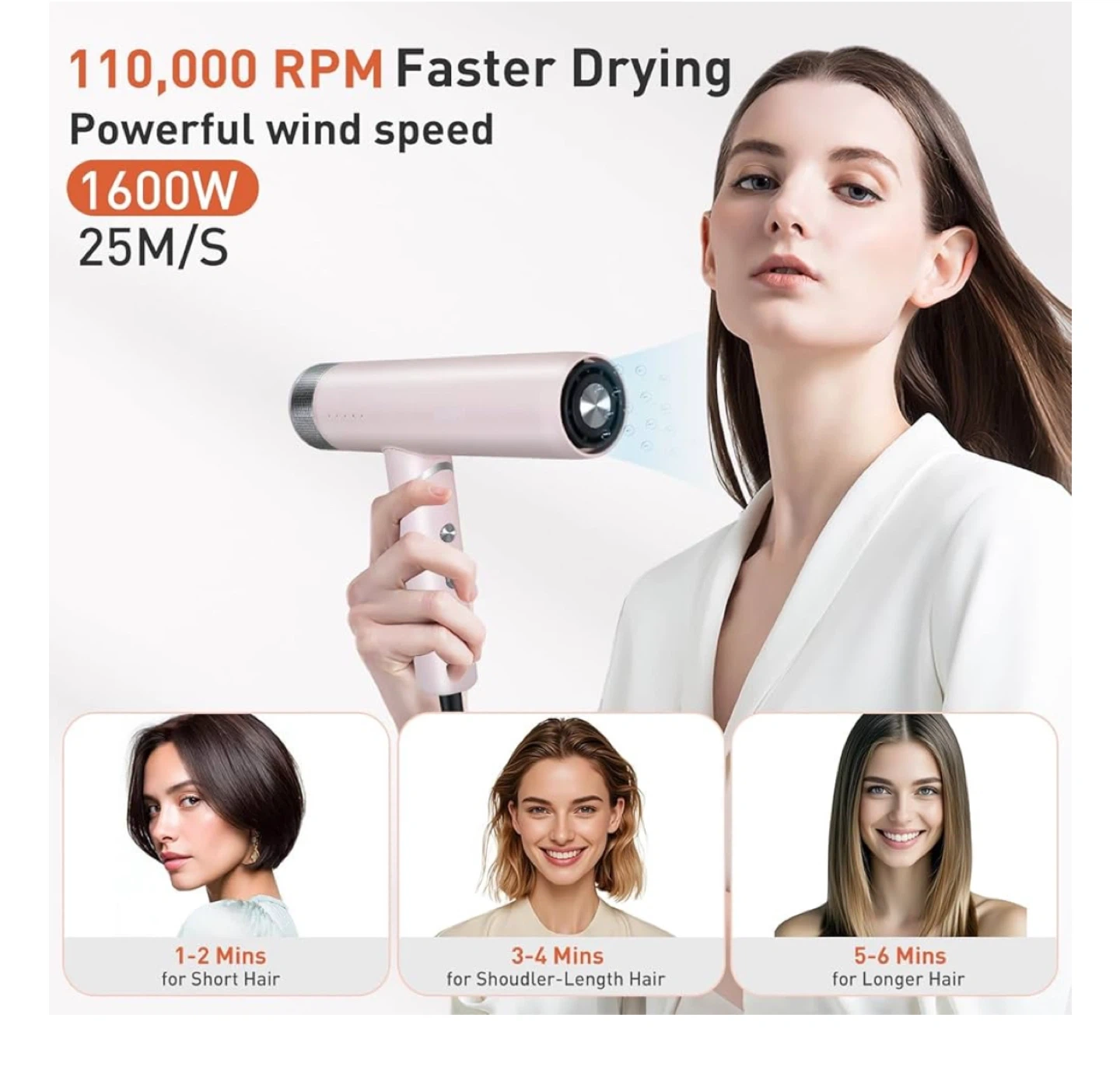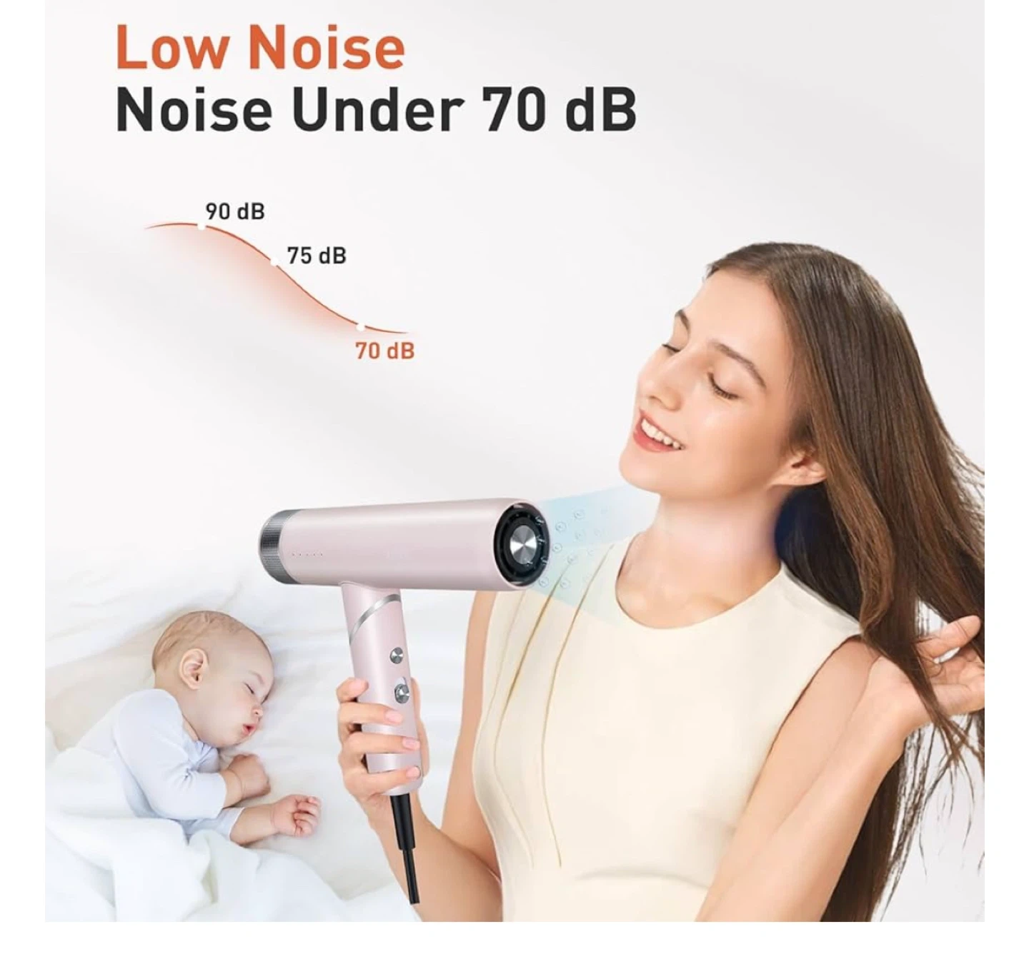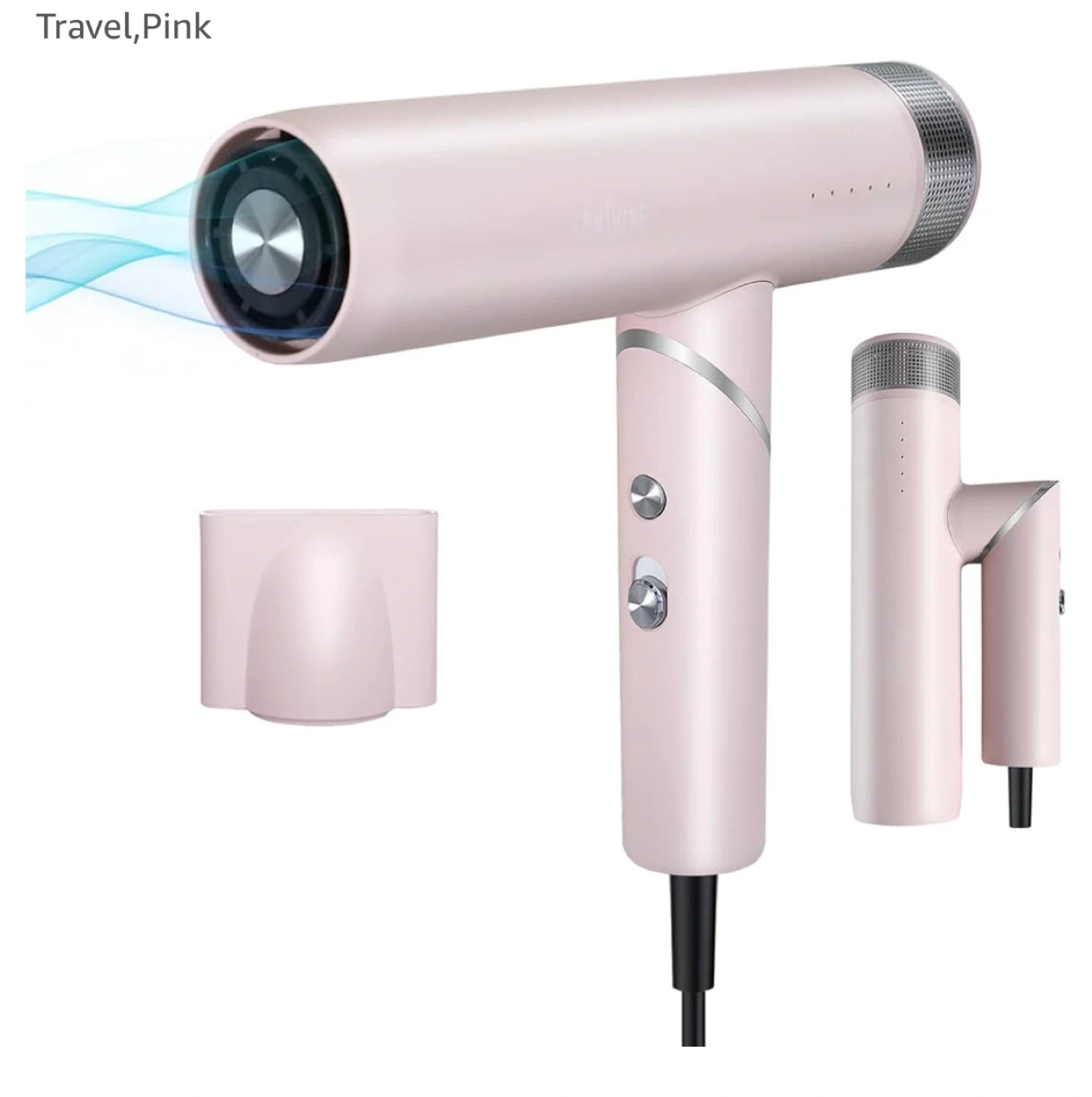 This pink hair dryer offers 110,000 RPM for faster drying with a powerful wind speed of 25M/S. It's lightweight at 0.88LB and features a foldable design, making it suitable for travel. The dryer operates at a low noise level, under 70 dB, and has 4 temperature settings and 2 wind speed settings.