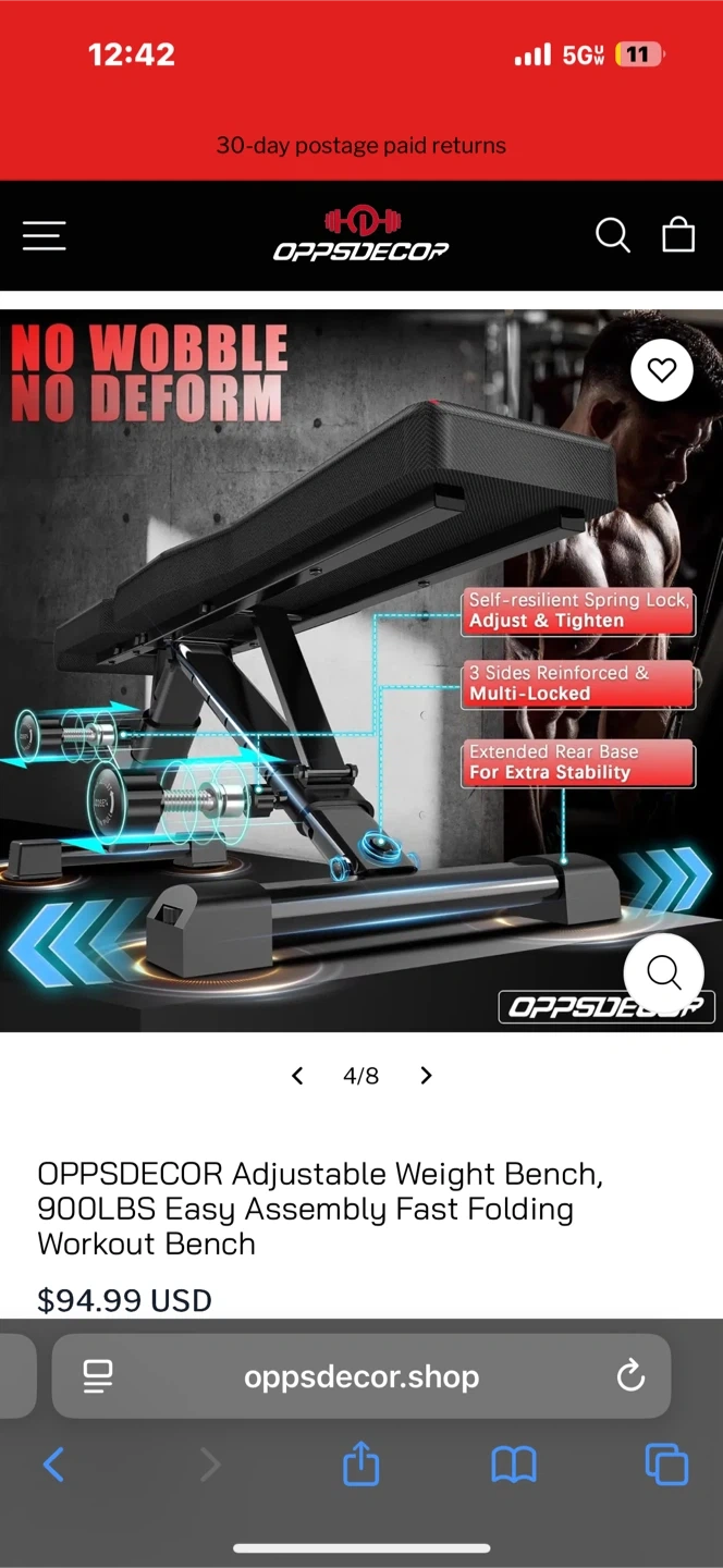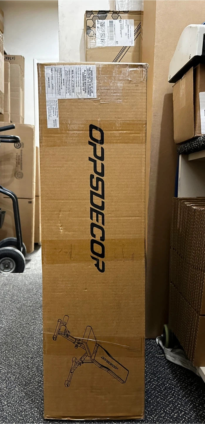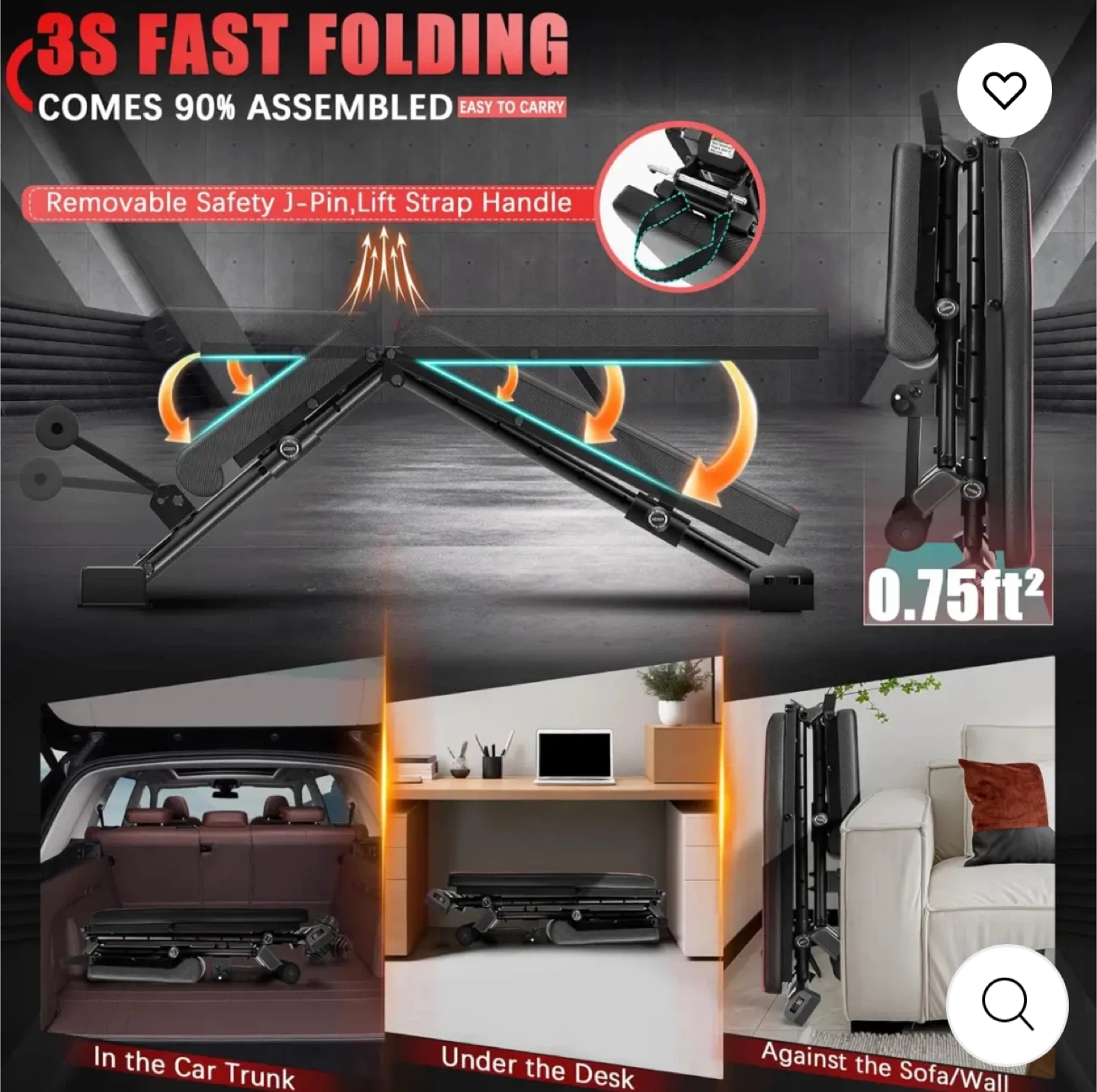 This is an OPPSDECOR adjustable weight bench. It's designed for fast folding and easy carrying. The bench is 90% assembled and comes with removable safety J-pins and a lift strap handle. It measures 0.75ft² when folded.