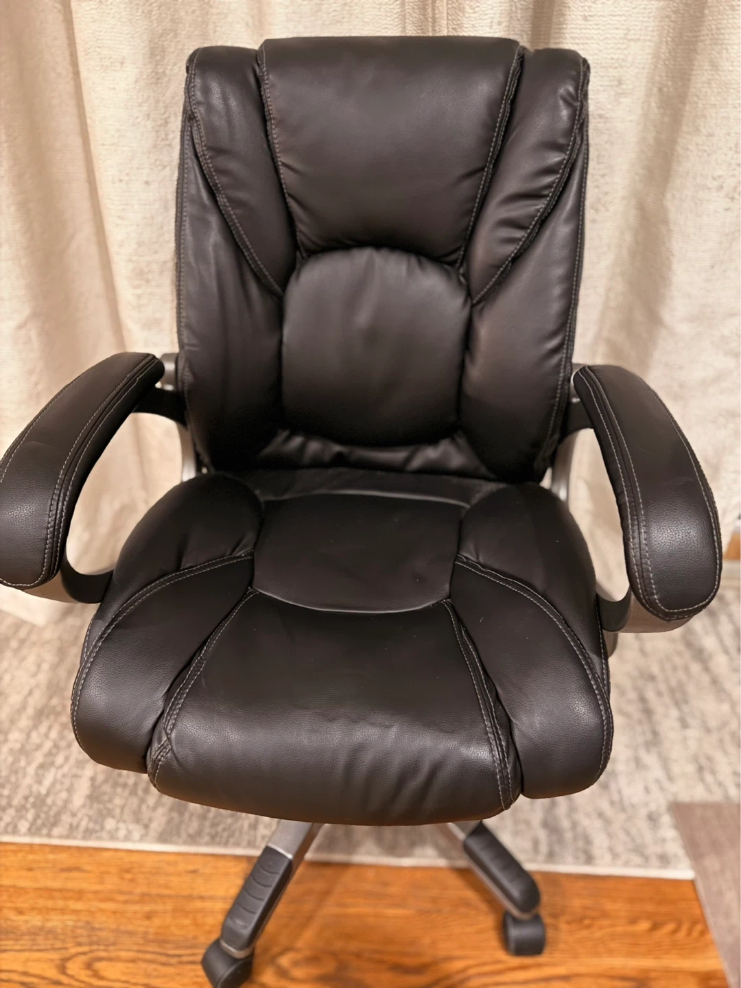This is a black executive office chair with faux leather upholstery. It features padded armrests and a high back for comfort. The chair has a sturdy base with wheels for easy mobility. Great for any home office!