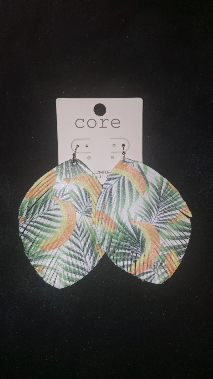 These Core earrings feature a fun tropical print with leaves and bananas. They're made from a lightweight faux leather material and have a fringed edge. Perfect for adding a playful touch to any outfit!