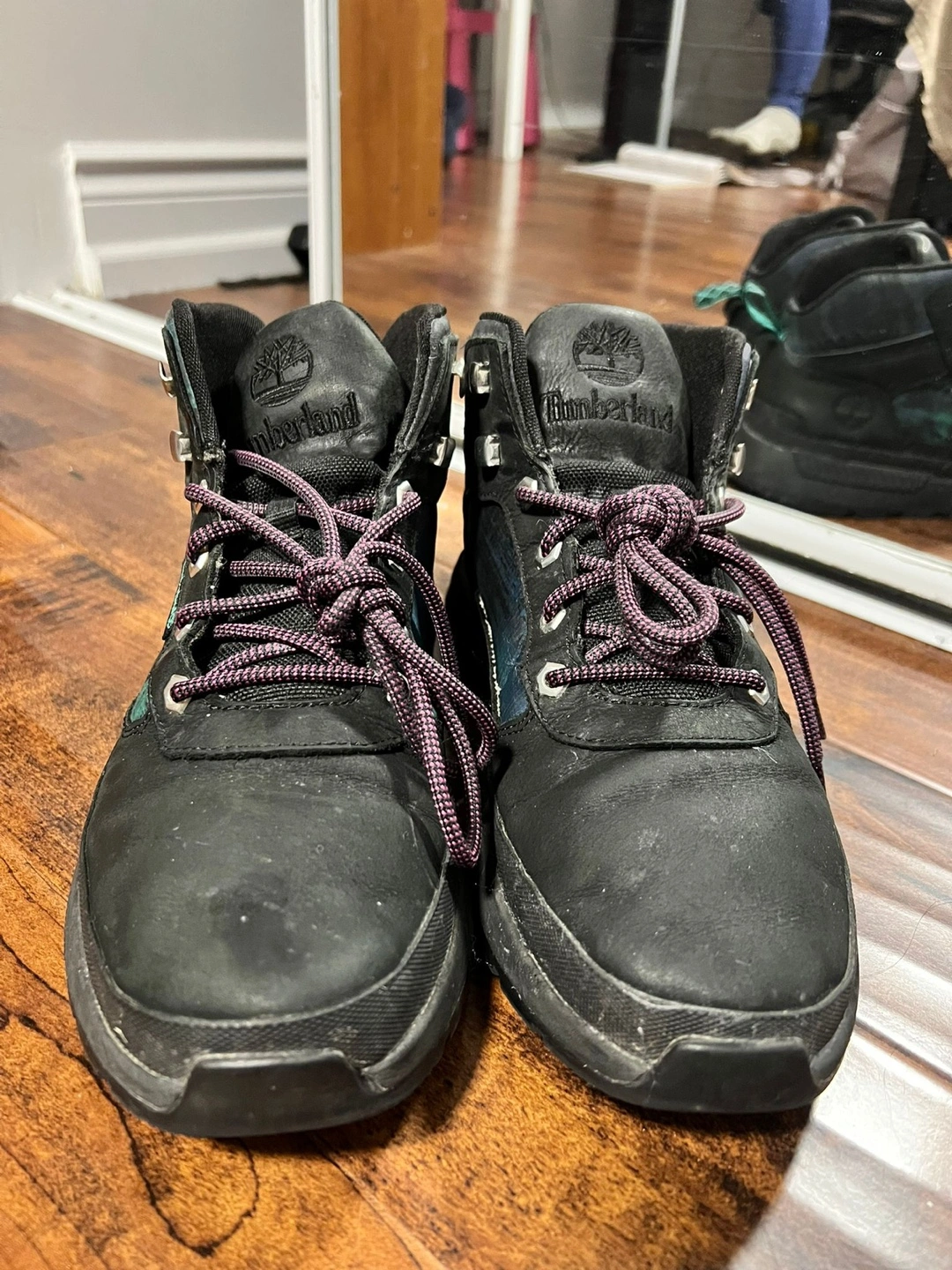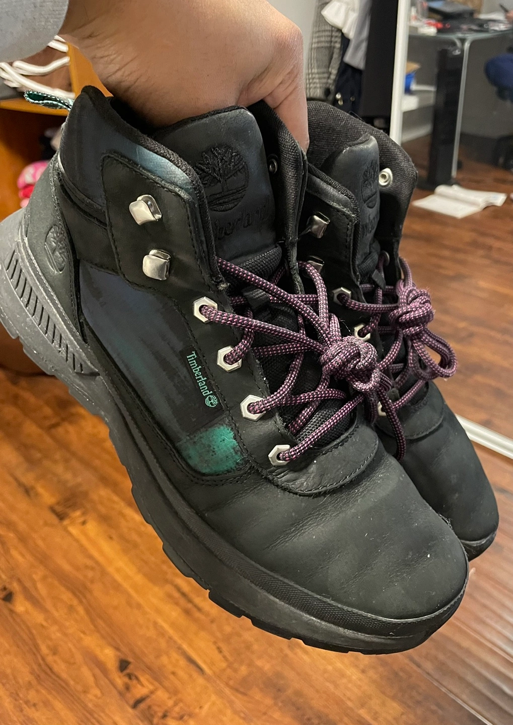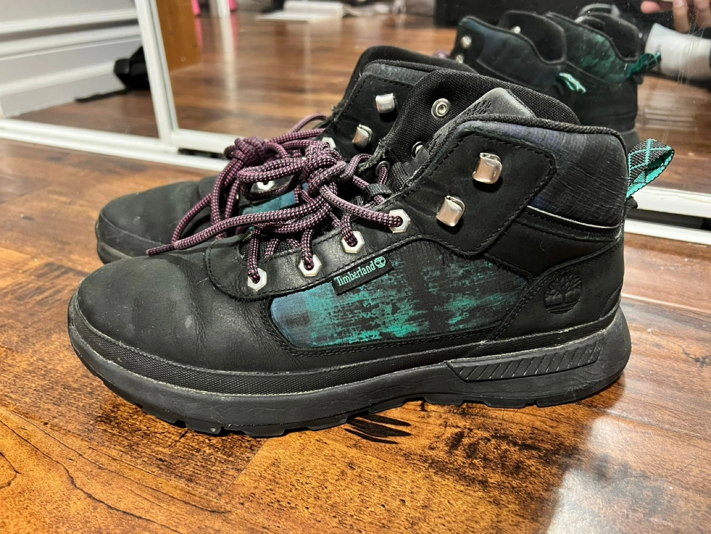 Black leather boots with green and purple accents. Lace-up closure with black laces. Lightly worn.