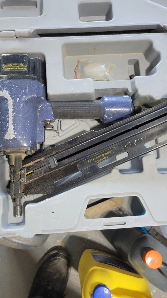 Selling a Central Pneumatic framing nailer. It's a 21 degree angled framing nailer. It uses 1/4" 18 NPT air inlet size. It can handle 10 GA nails 2-3/16" to 3-1/2" in length. Air capacity is 1.2 CFM at 90 PSI