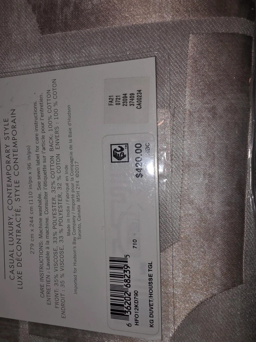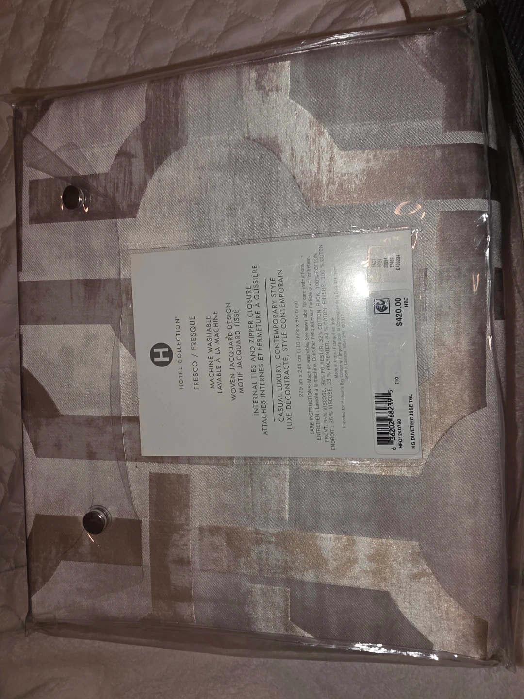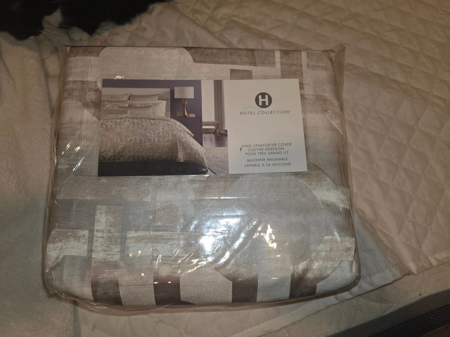 This is a Hotel Collection King Comforter Cover in a casual luxury, contemporary style. It's machine washable. The dimensions are 279 cm x 244 cm (110 in x 96 in).