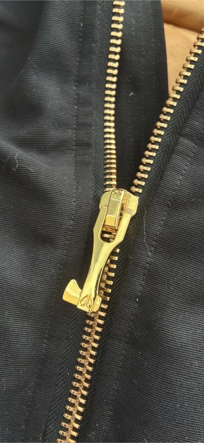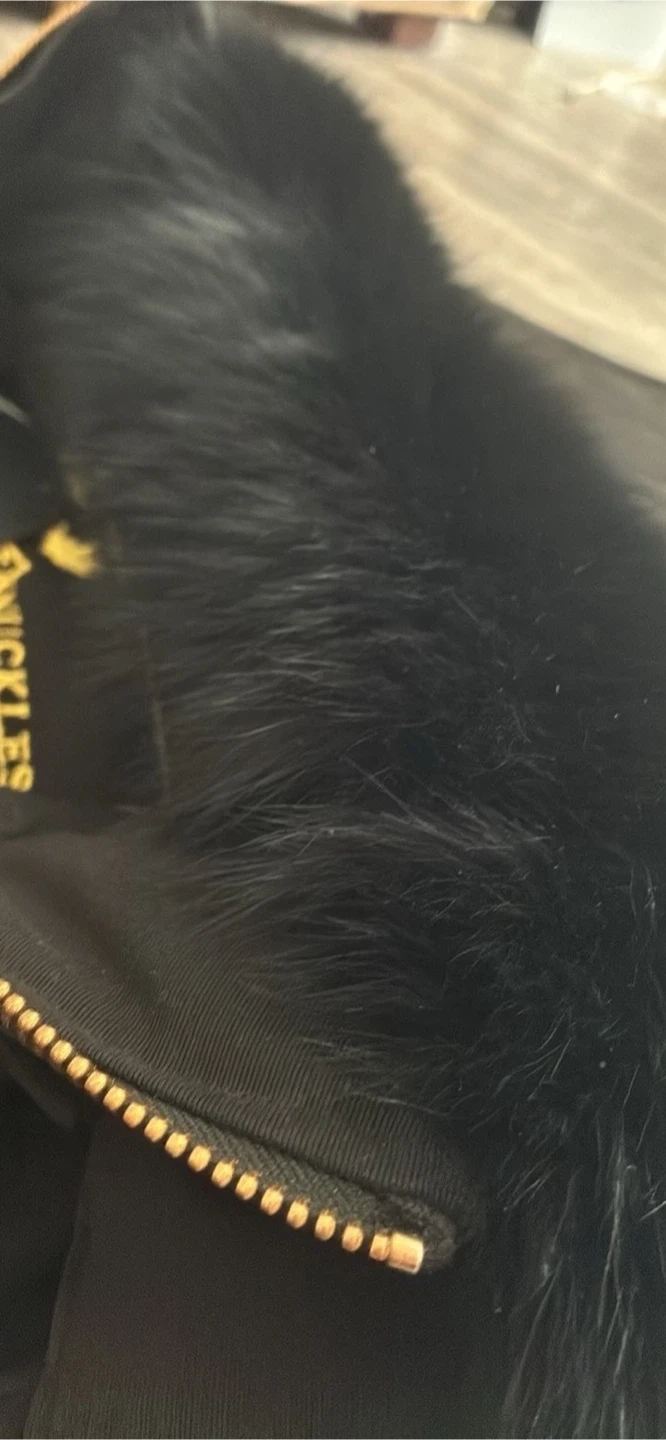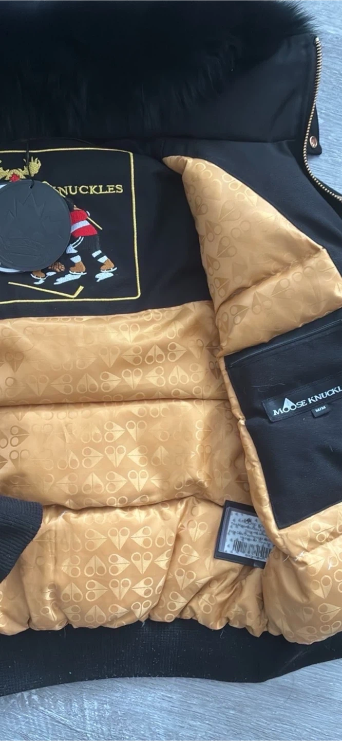 Warm black Moose Knuckles bomber jacket. It features gold hardware and a detachable fur-lined hood. The lining has a gold pattern with the Moose Knuckles logo. Size M.