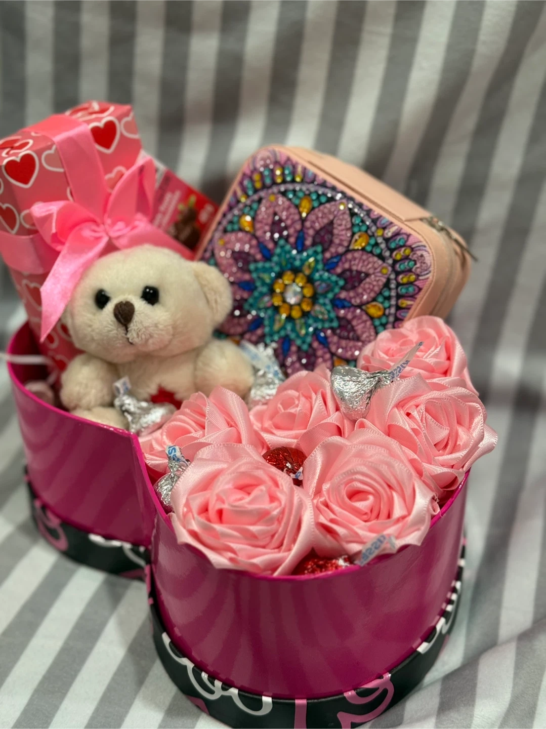 A sweet Valentine's Day gift basket! It includes a cute teddy bear, pink roses, chocolates, and a decorative zippered pouch. Perfect for a loved one!❤️
