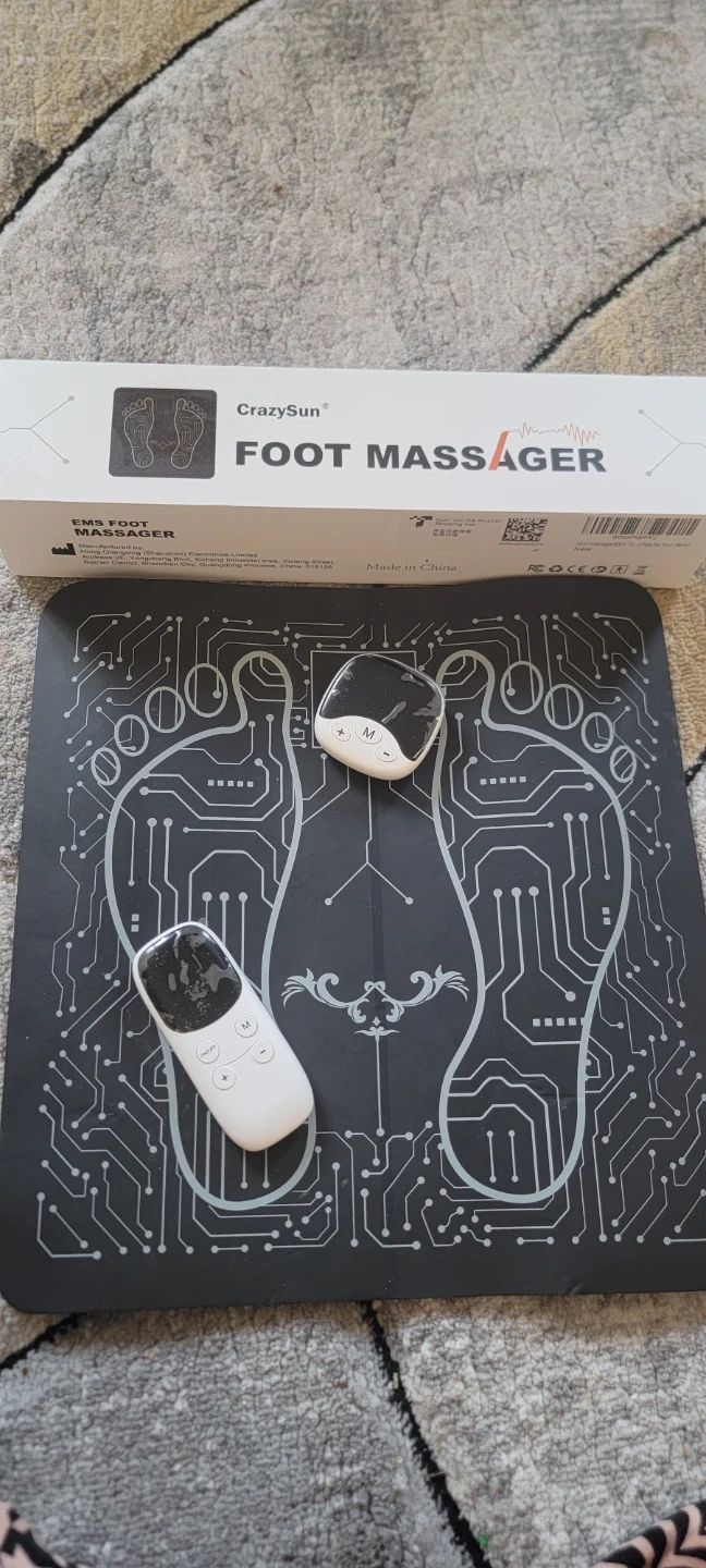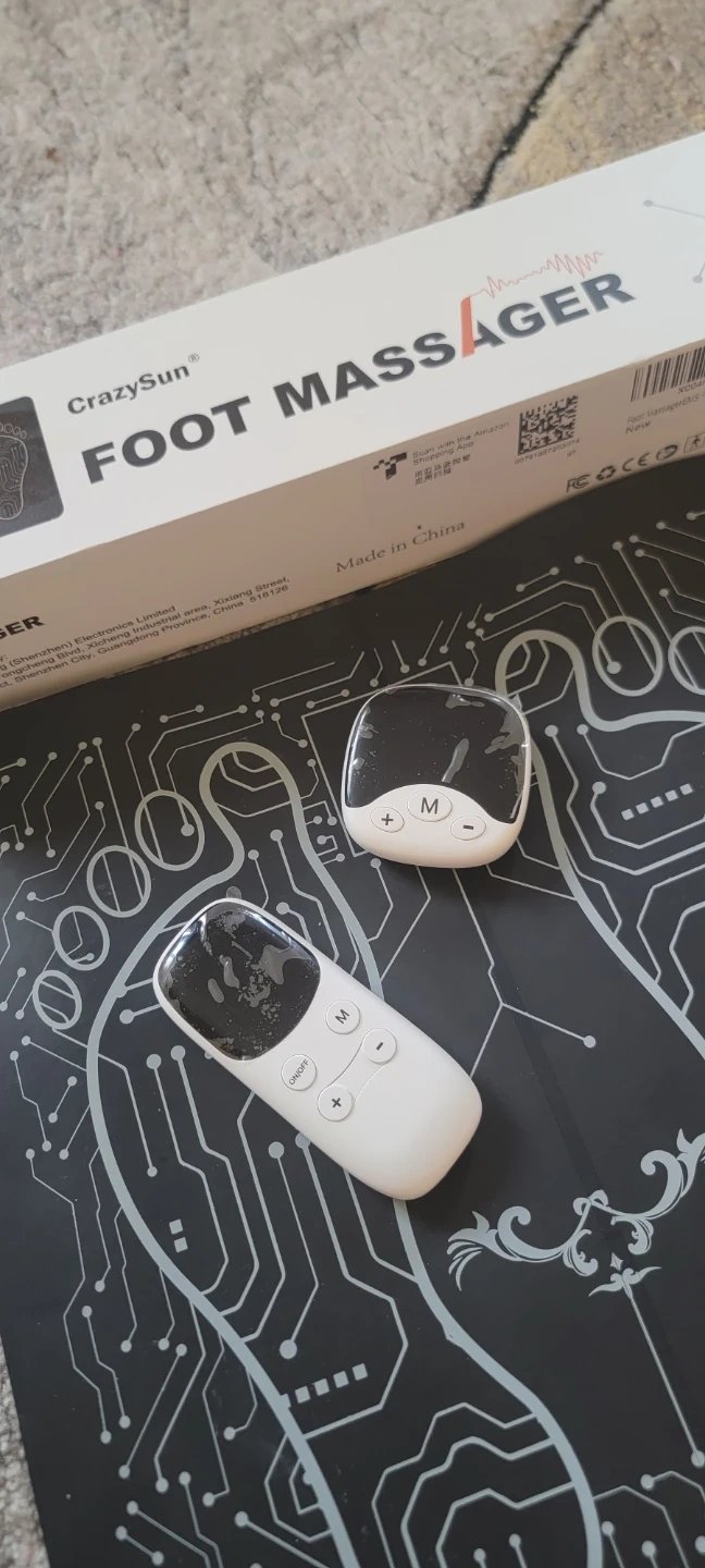 This is a CrazySun EMS foot massager. It includes a mat and two remote controllers for operation. It's designed to provide a soothing massage experience for your feet.