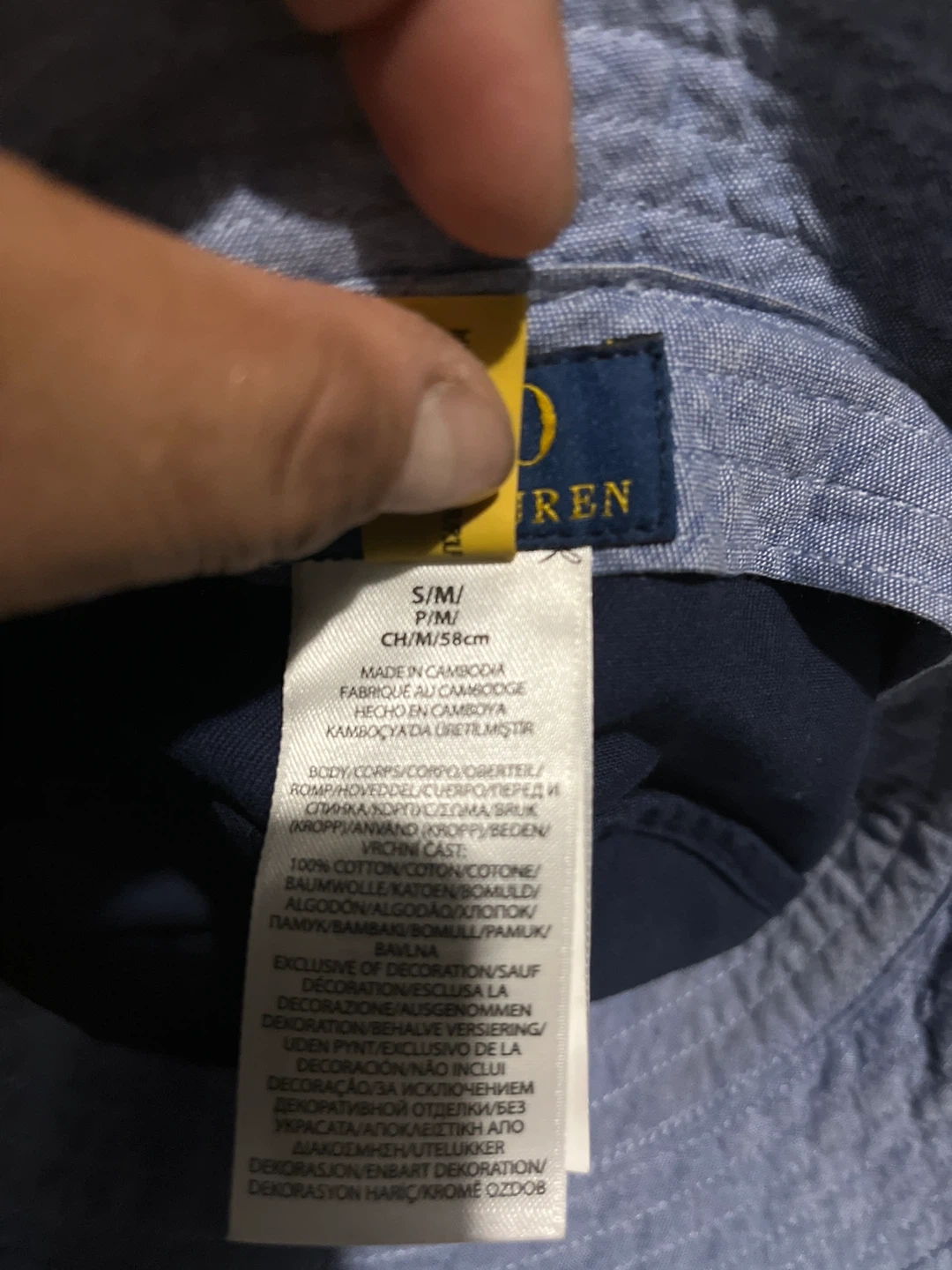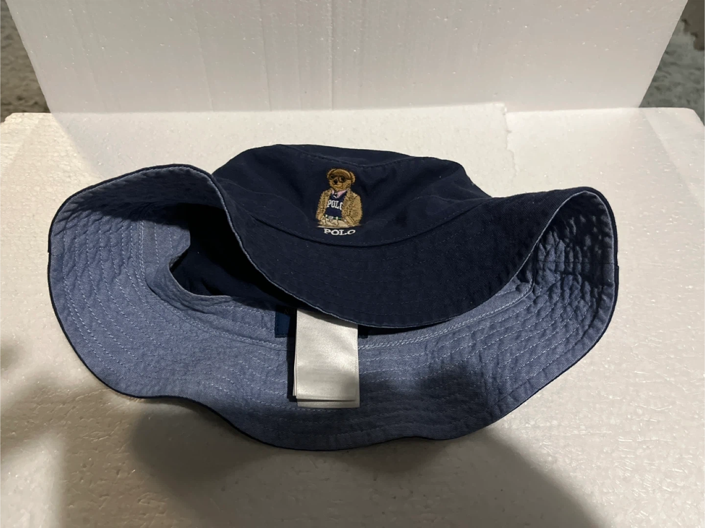 Navy bucket hat from Polo Ralph Lauren featuring a classic bear embroidery. Made from 100% cotton. Size S/M. It's non-reversible with a light blue interior lip.