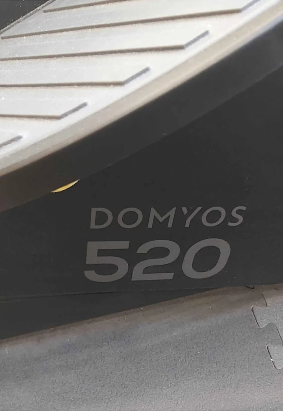 DOMYOS 520 elliptical cross trainer in black and yellow. It's equipped with a console displaying speed, time, distance, calories, and RPM. Features 9 programs and Bluetooth connectivity. Excellent for home cardio workouts!