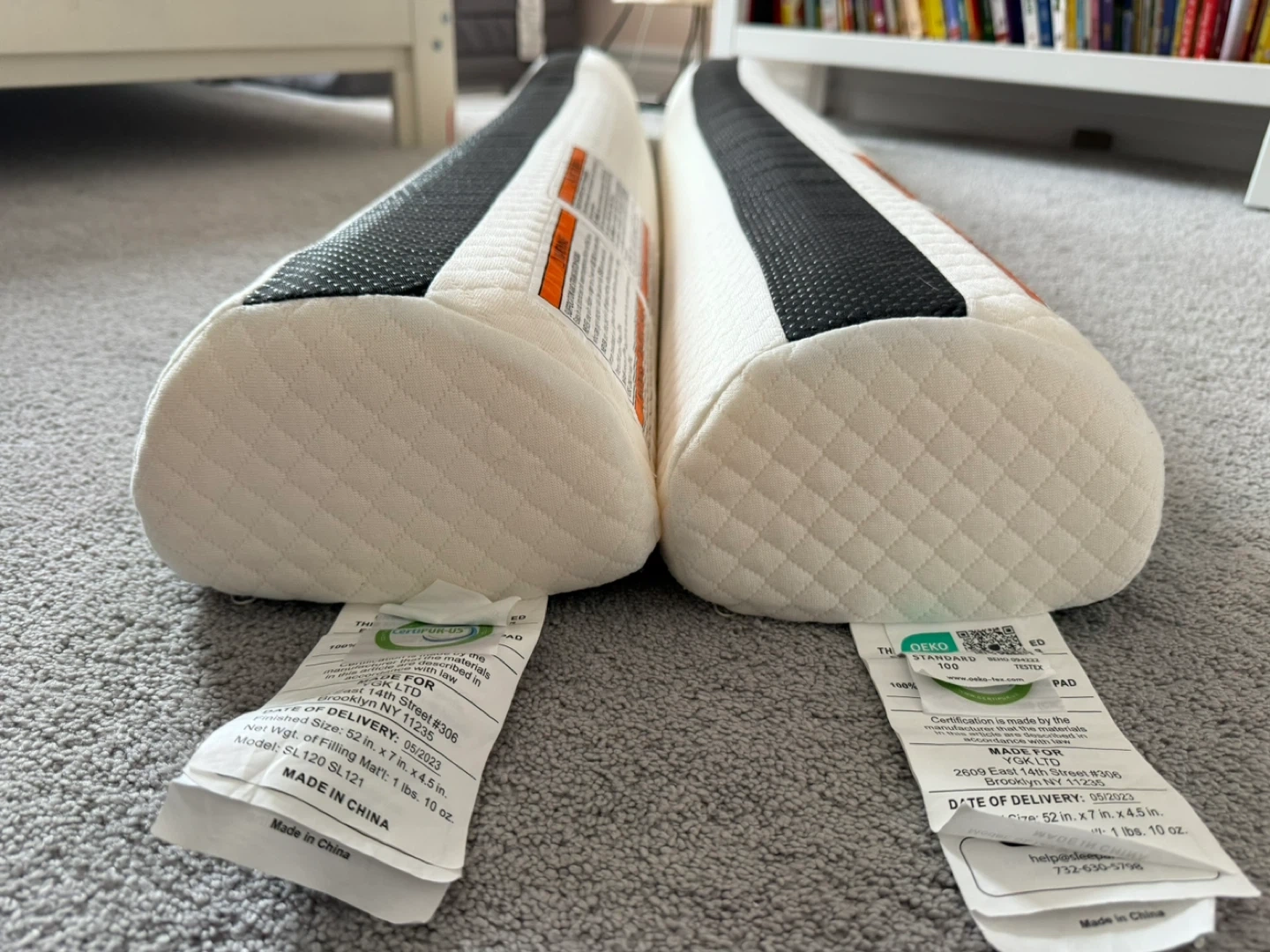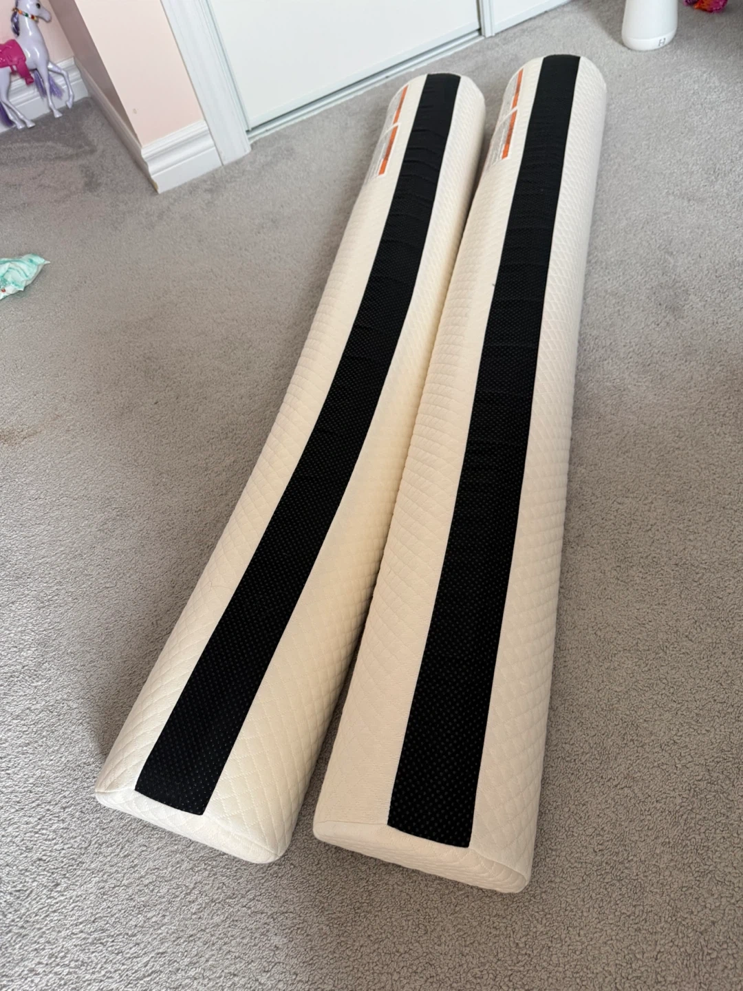Set of two adjustable bed frame rails. They're designed to attach to most bed frames. Rails are beige with black accent strips. Covers are machine washable