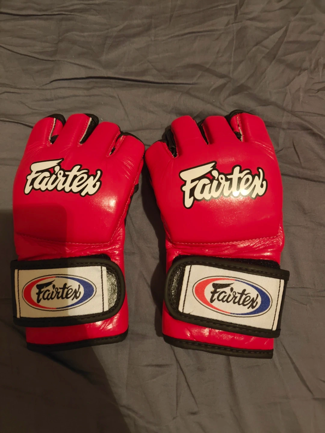 Fairtex red MMA gloves with velcro closure. These gloves are made of leather. Used for training and sparring. Never used
