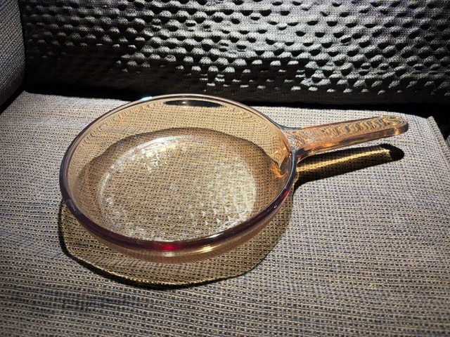 Vintage 80’s Corning Ware VISION 7.5 Inch Waffle Bottom Frying Pan Skillet Amber (France/Pyrex). No cracks, no chips, great condition. A classic! A beautiful addition to your kitchenware. Pickup only in Burlington (Pinedale Ave). FIRM AT $20. No holds.