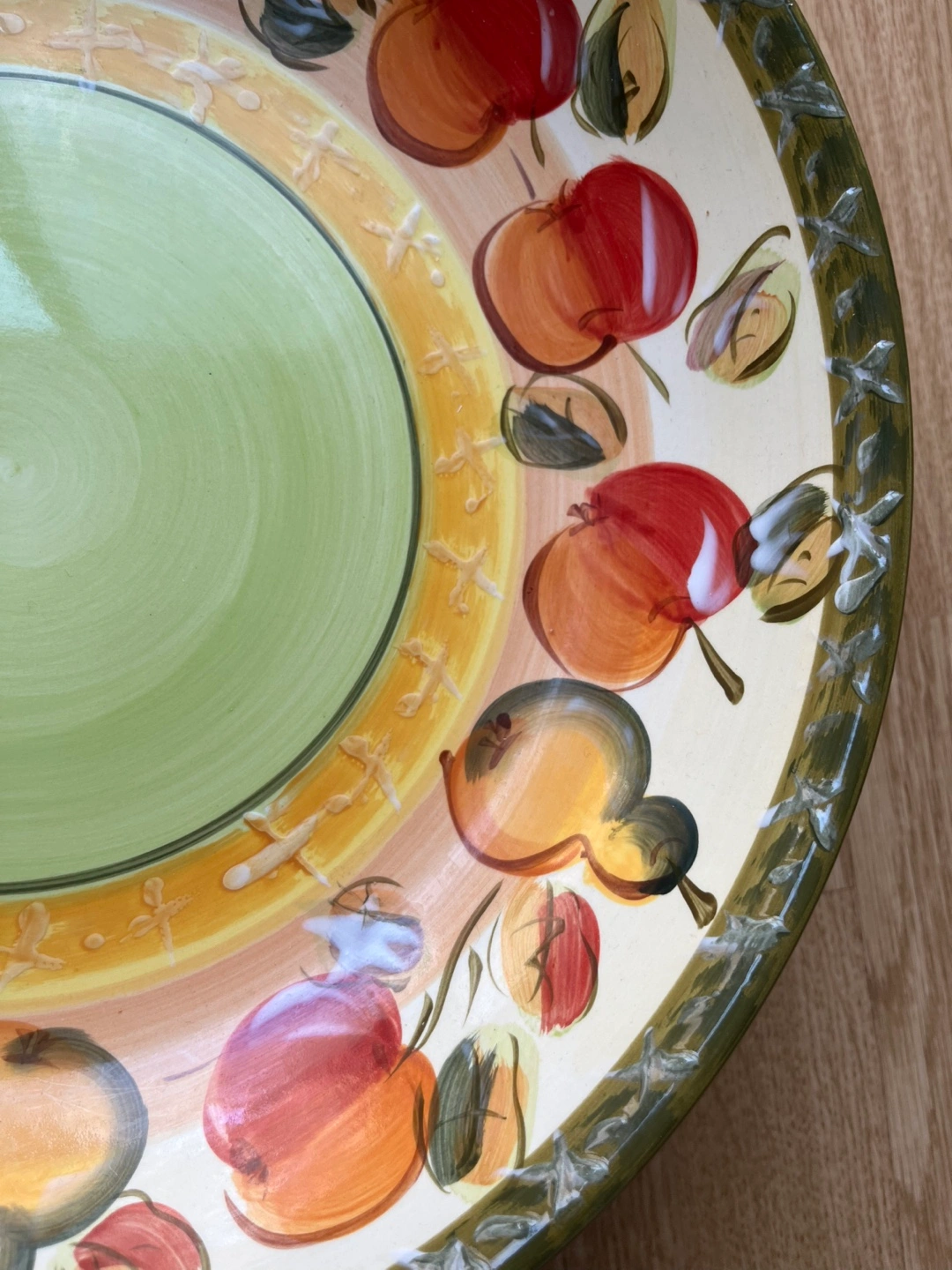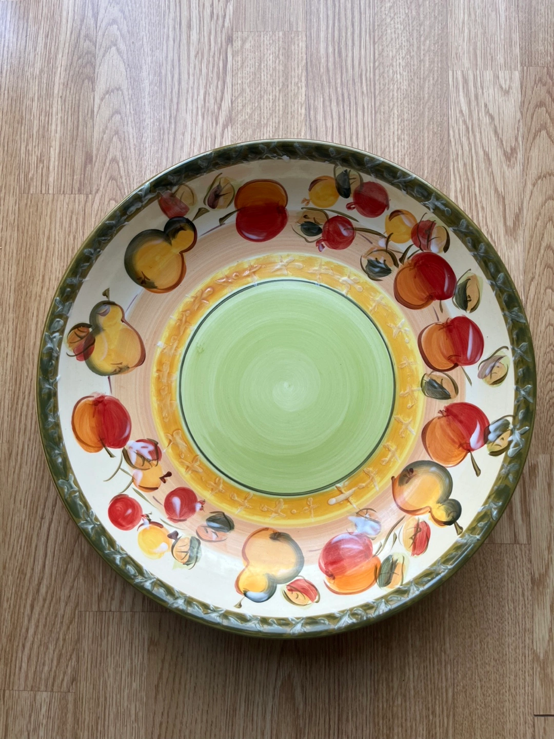 Hand-painted ceramic bowl. Features a green, yellow, and orange design with apples and pears. Large size, perfect for centrepieces or fruit displays. Beautiful colours.