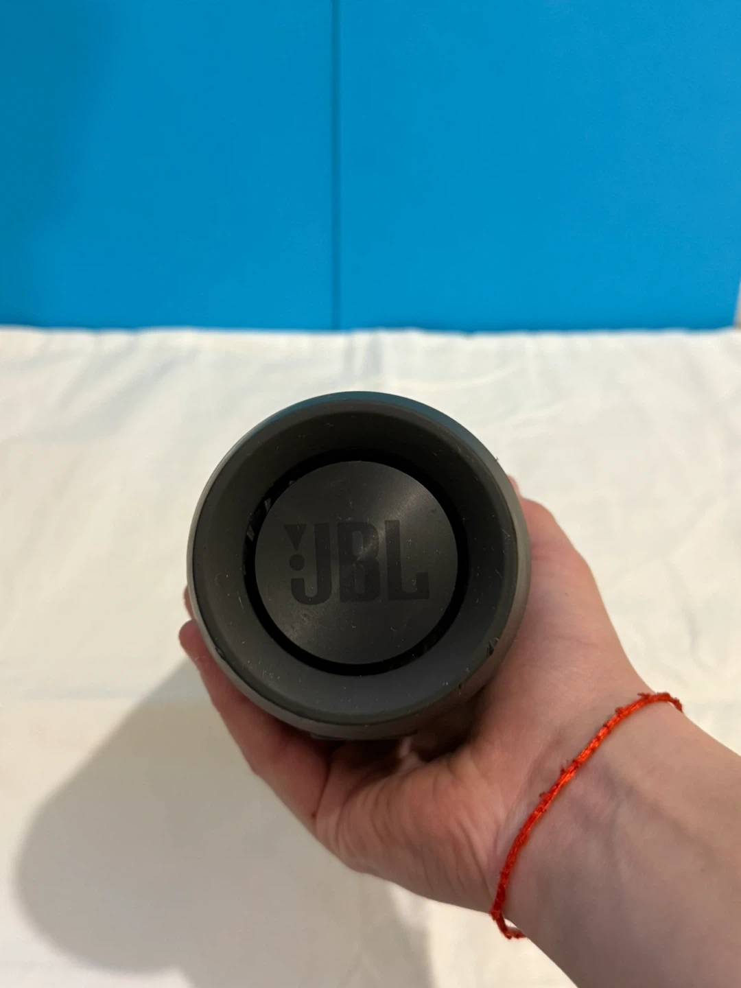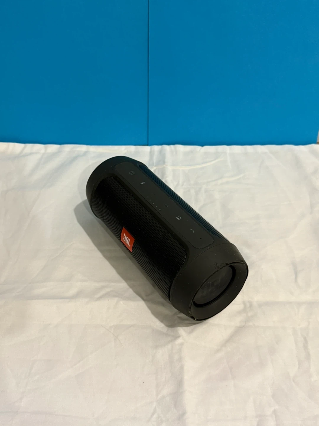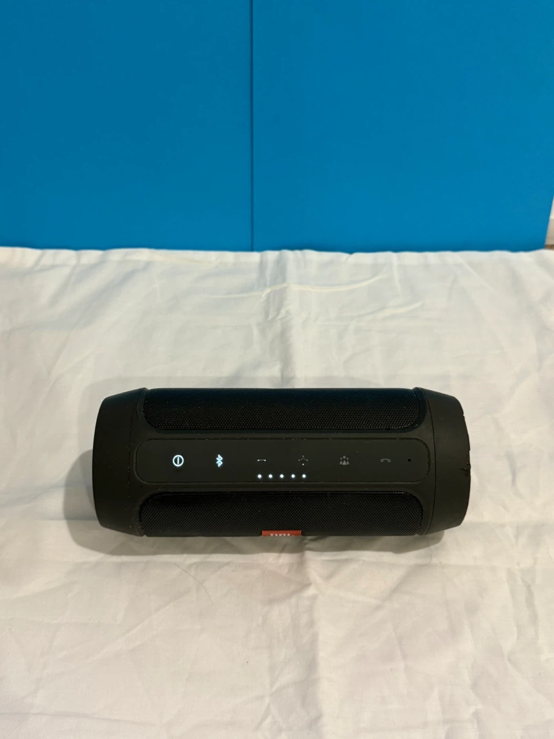 This is a black JBL Charge 2+ portable Bluetooth speaker. It's been used but still works great. Connect your devices wirelessly for music on the go! Perfect for backyard BBQs or a day at the park. Has a few small dents. Comes with a short charger