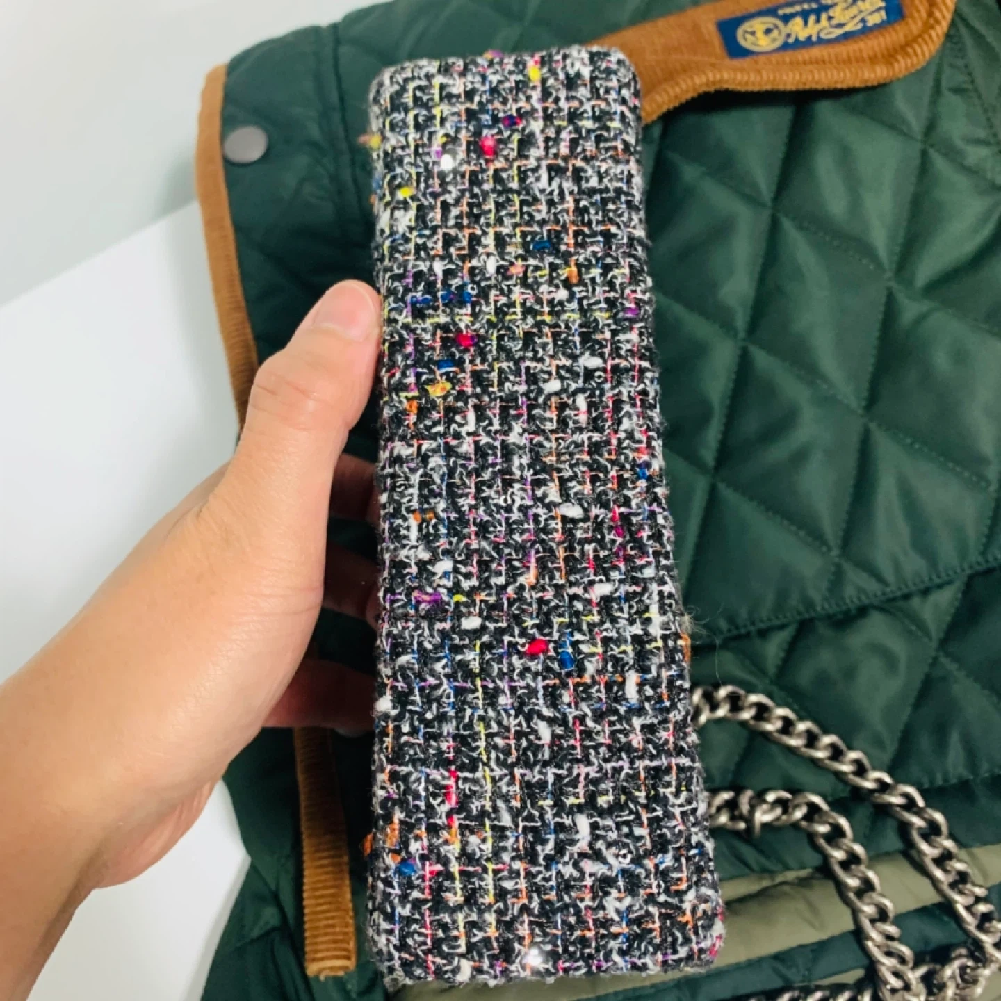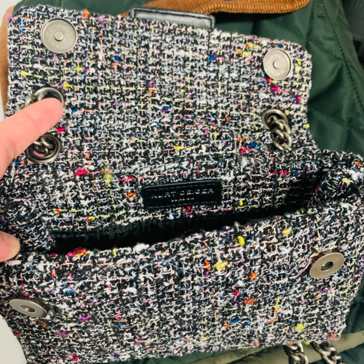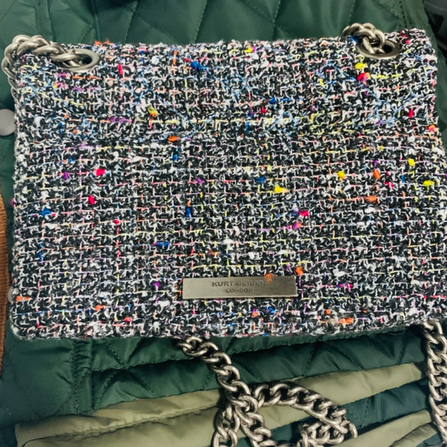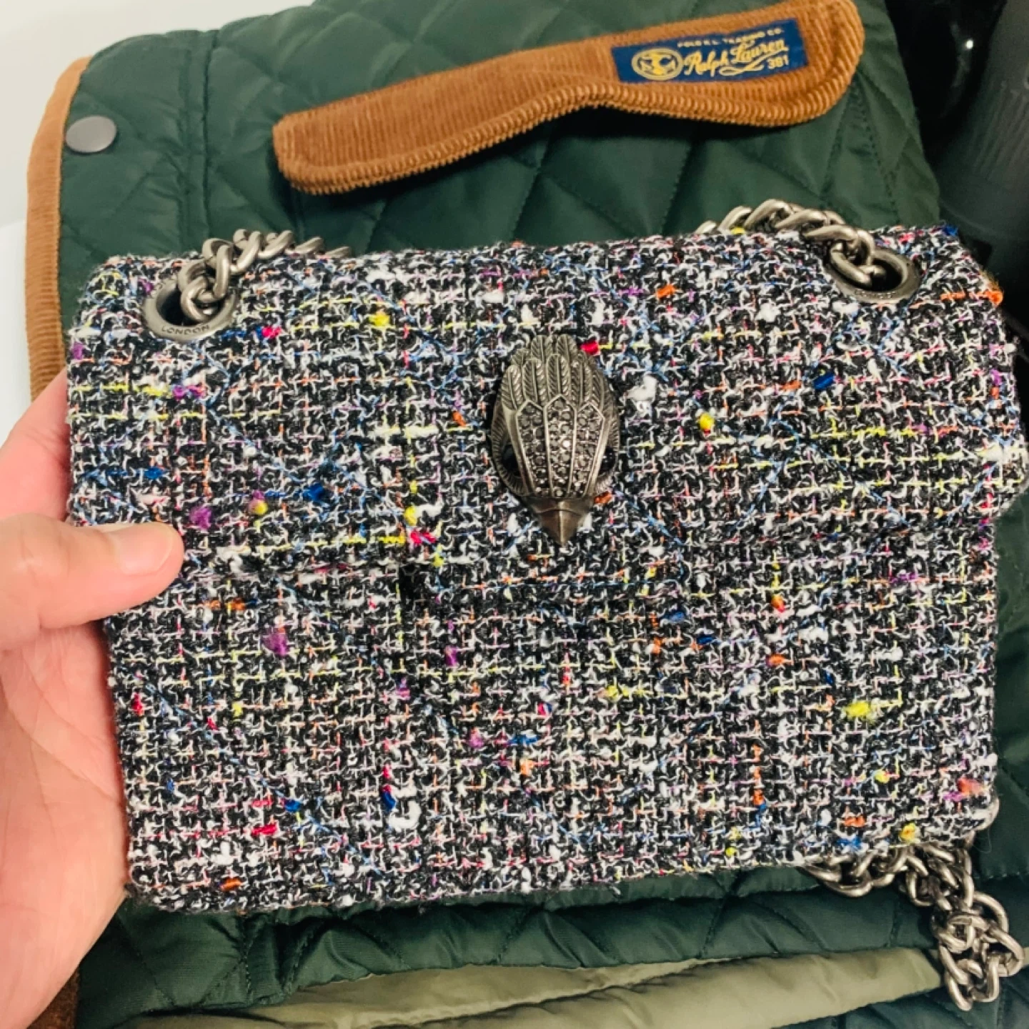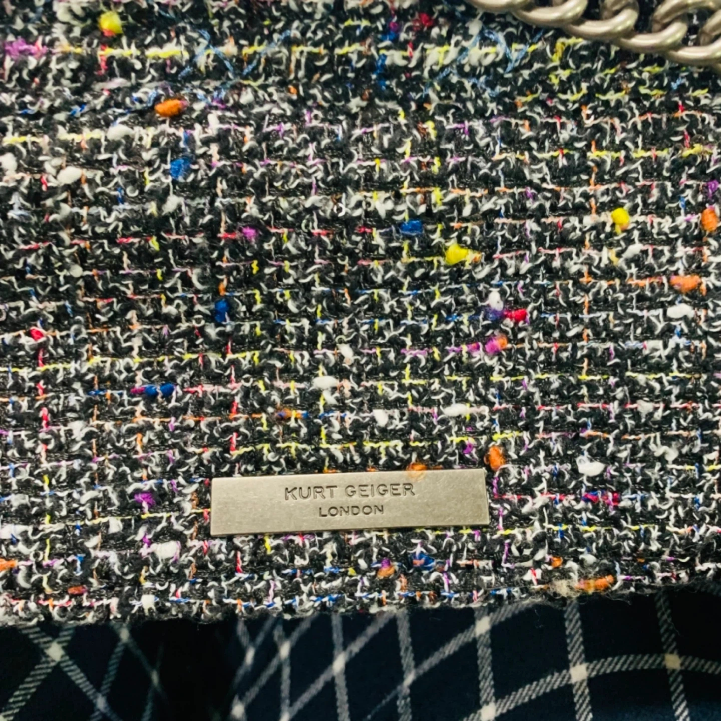 This is a Kurt Geiger shoulder bag made with a colourful tweed fabric. It has a silver chain strap and a distinctive eagle head clasp. It's a stylish accessory for any outfit!