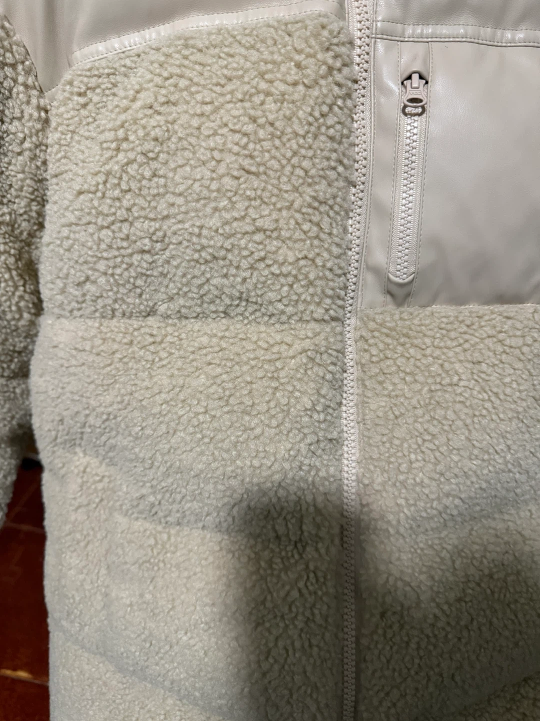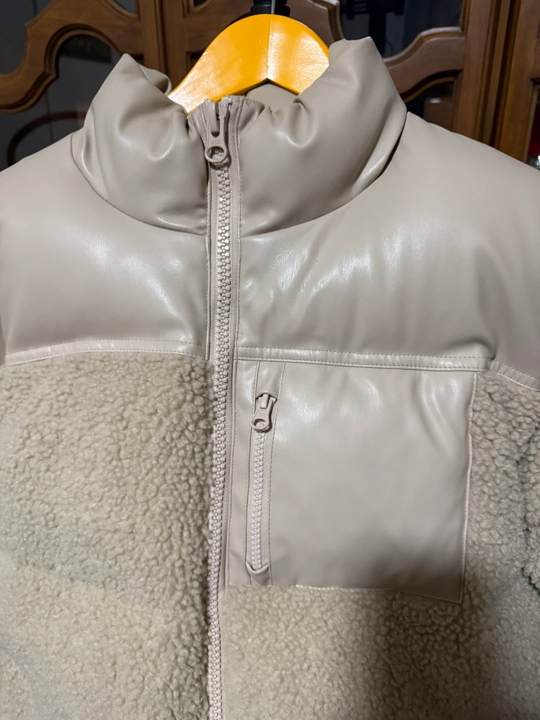 Cream sherpa jacket with faux leather paneling on the shoulders and chest. It features a zip-up front and a chest pocket with a zipper closure. Cozy and stylish for cooler weather!