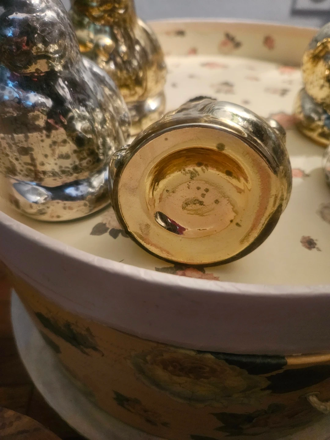 These are a set of five vintage of Kugels blown glass.Mercury Christmas ornaments. Each ornament has a hanging loop.r! Collectible.