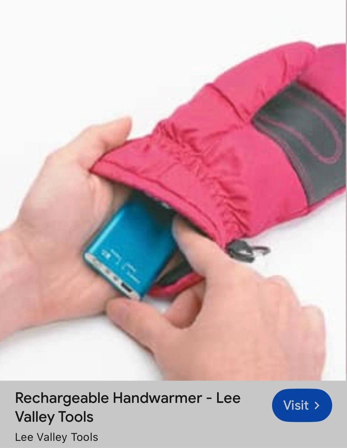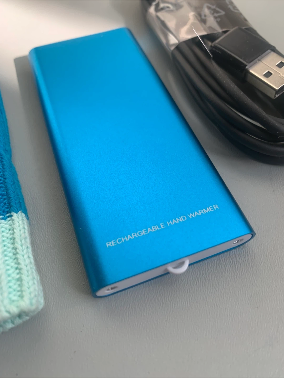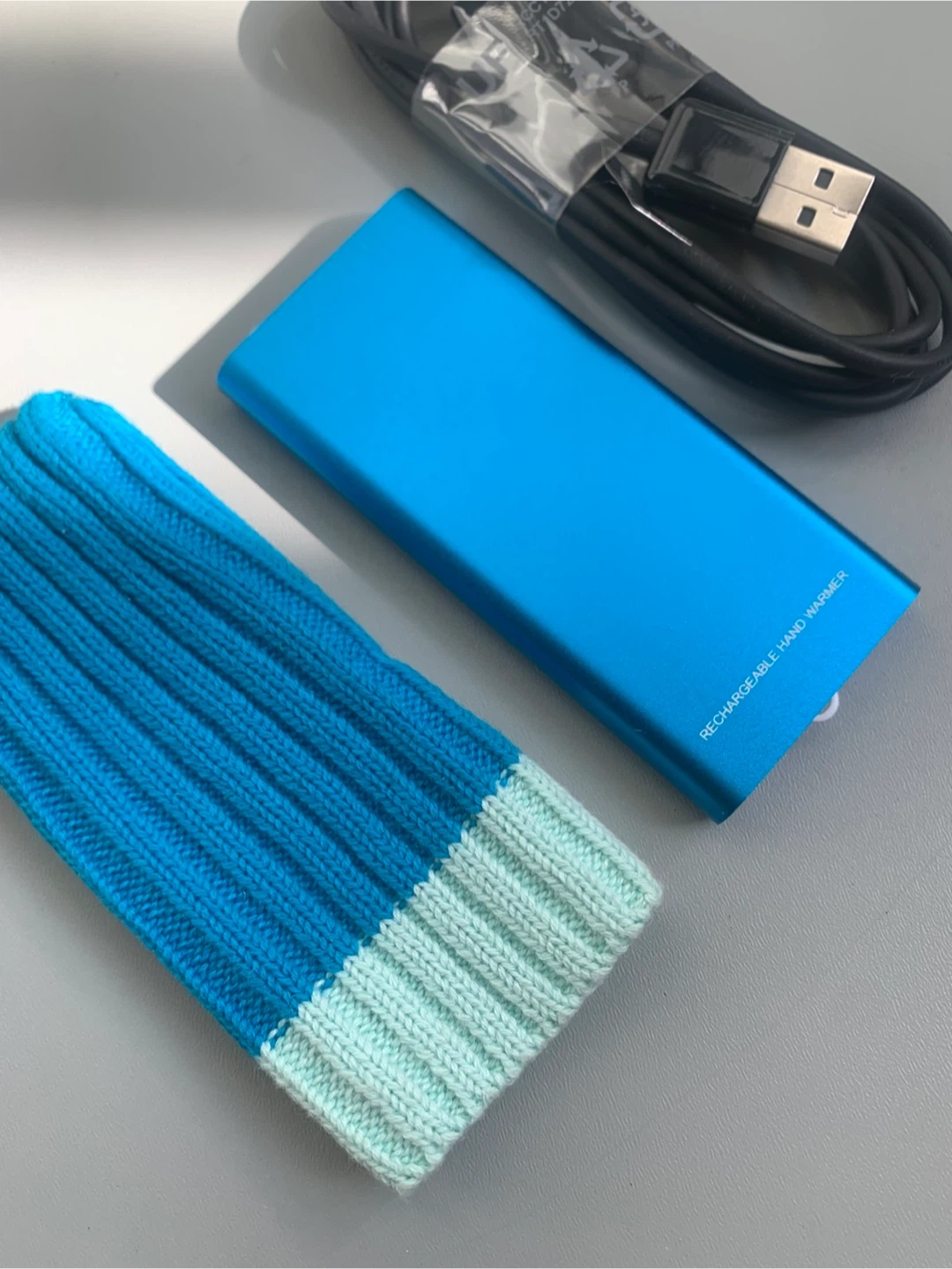 •Lee Valley blue rechargeable hand warmer, perfect for keeping your hands toasty on cold days. It comes with a USB charging cable and a knit sleeve. It's compact and fits easily in a pocket.