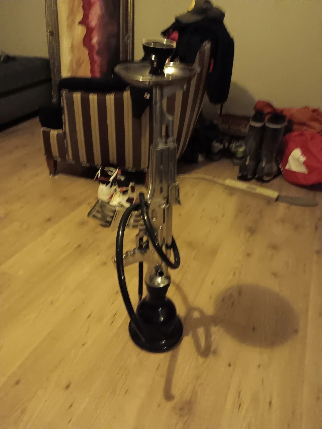 This unique hookah features a design inspired by the Kalashnikov AK-47 rifle. It comes with a black base and a metal stem. The hose and bowl are also included.