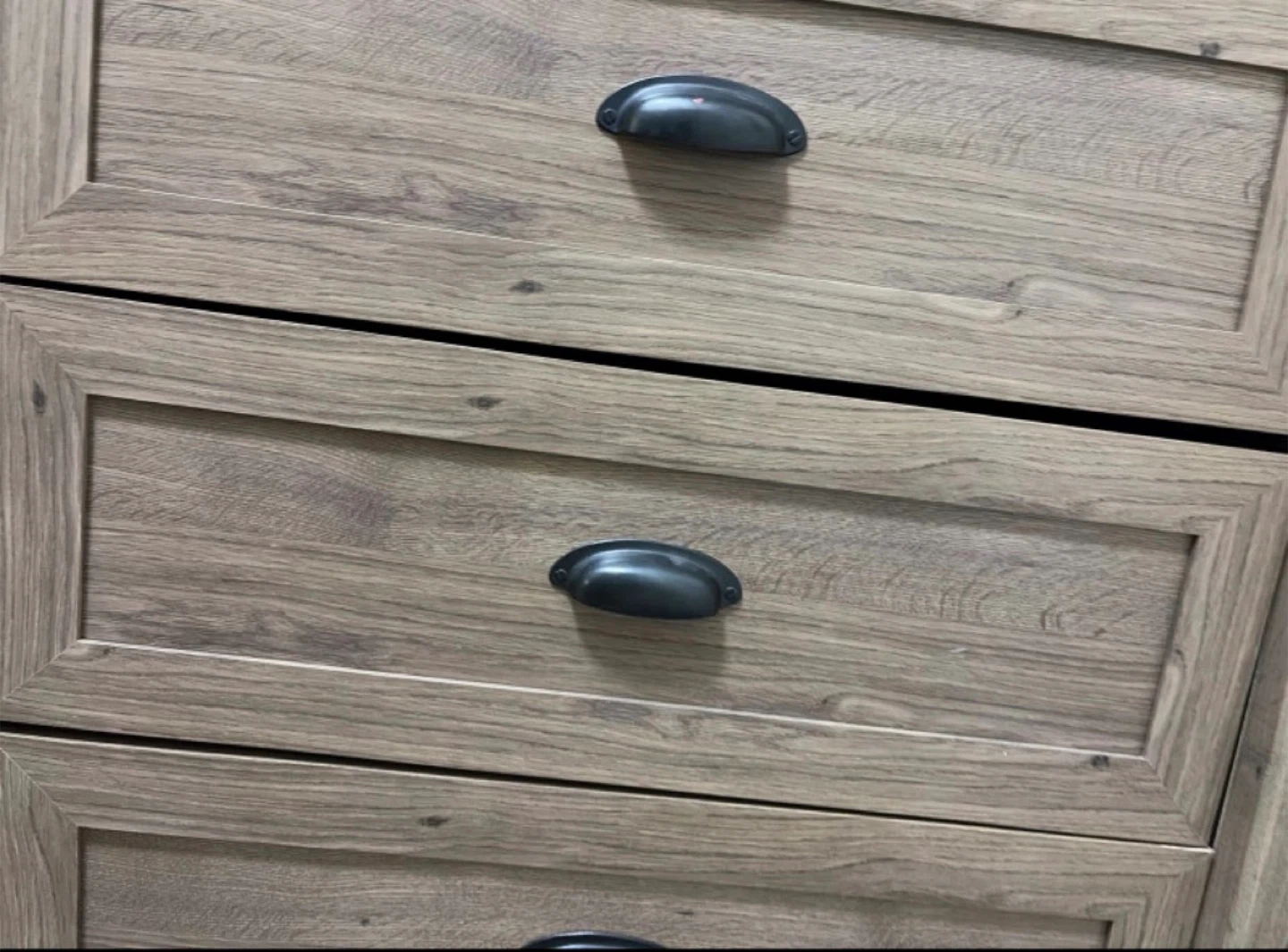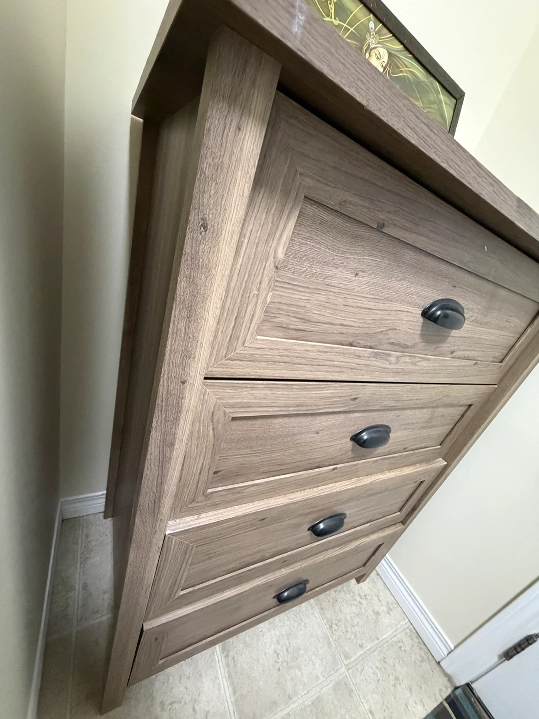 This is a four-drawer dresser with a wood finish and black handles. It offers ample storage space for clothes or linens. It's a great addition to any bedroom! We are selling because we are moving, the top has some scratches and two drawers have a small gap in between.
