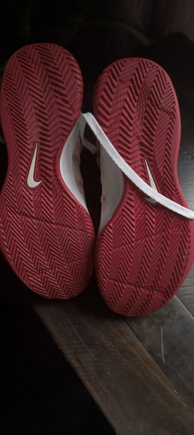 Nike Hyperfuse basketball shoes in white with maroon accents. Low-top design with lace-up closure. Rubber sole provides good traction.