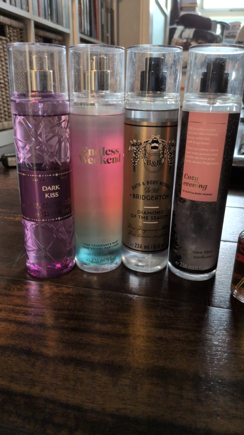 $7 EACH, except for the farthest right which goes for $4 since it is used. Four Bath & Body Works fine fragrance mists, each 236 ml / 8 fl oz. Includes Dark Kiss, Endless Weekend, Diamond of the Season with Bridgerton, and Cozy Evening scents. The one farthest to the right is more used, but the rest are full