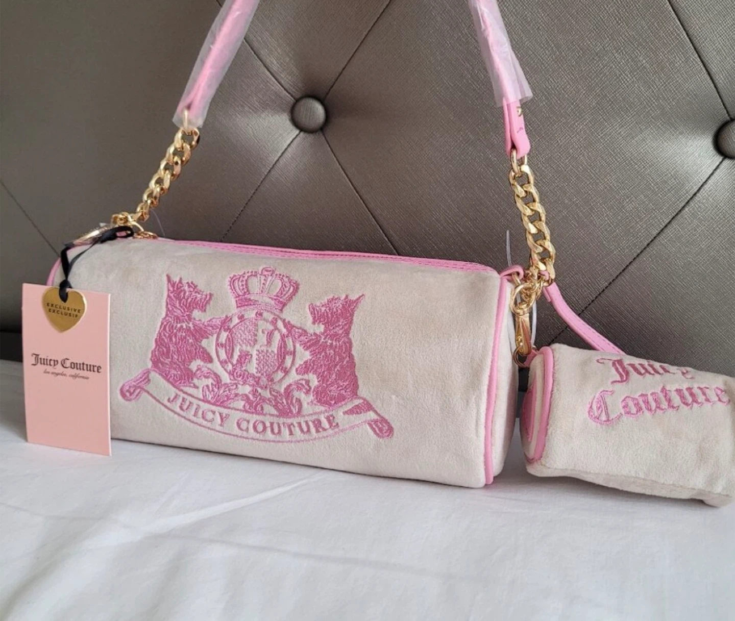 This is a Juicy Couture velour baguette bag in cream with pink embroidery. It features a gold chain and pink strap. Includes a matching coin purse. Perfect for carrying essentials with a touch of Y2K flair!