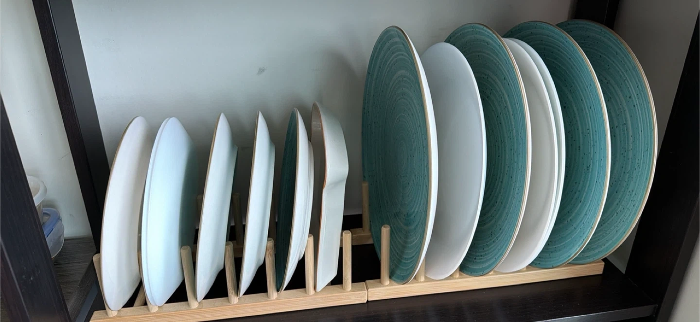 Beautiful set of 9 plates, featuring a mix of teal with a textured spiral design and plain white. They have a lovely gold rim detail. The teal plates are ideal for adding a pop of colour to your table setting. Measures approximately 10 inches in diameter.