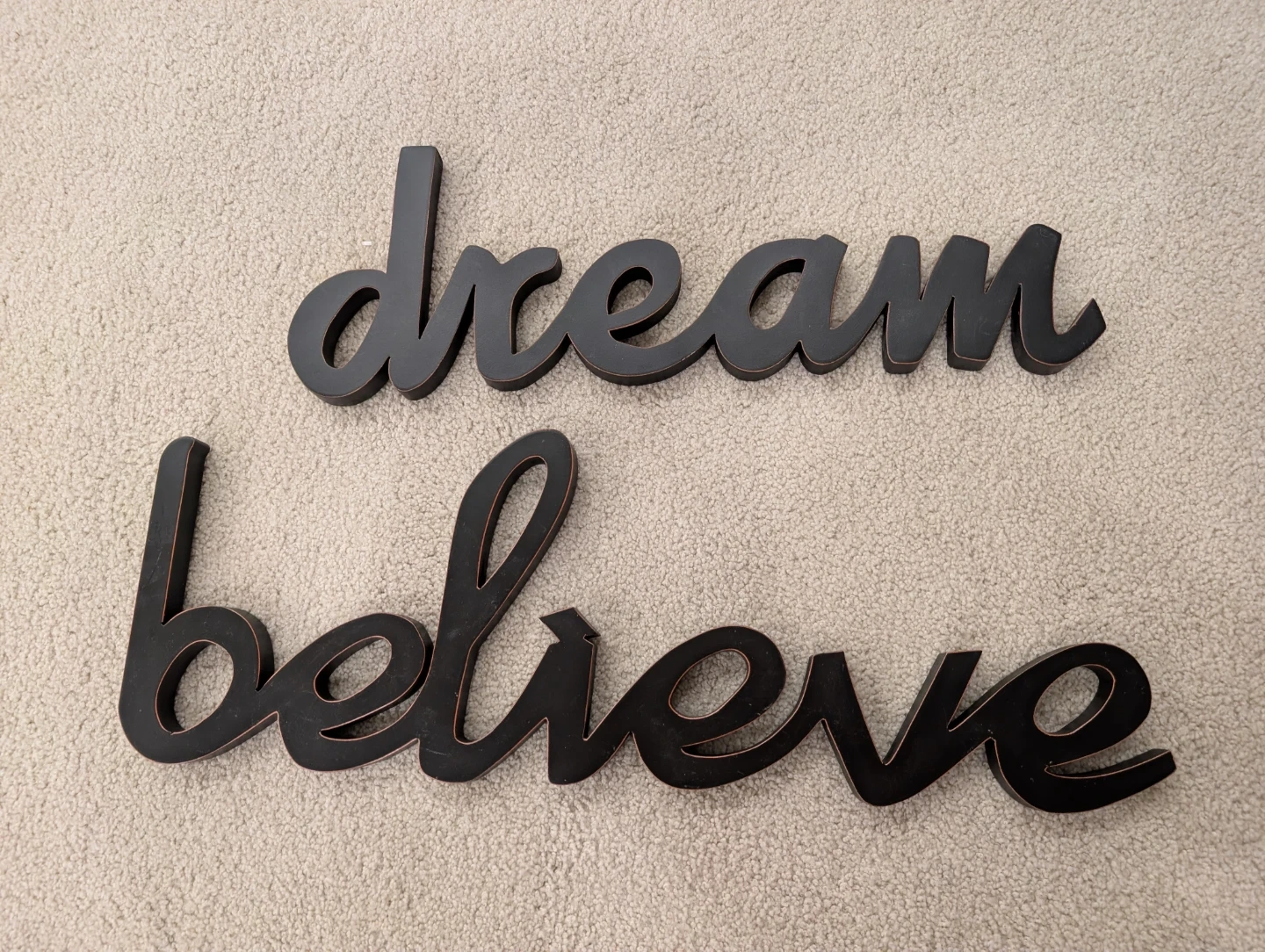 This is a set of two wooden wall art pieces spelling out "dream" and "believe". The words are in a stylish script font. They're a dark brown or black colour, perfect for adding a motivational touch to any room.