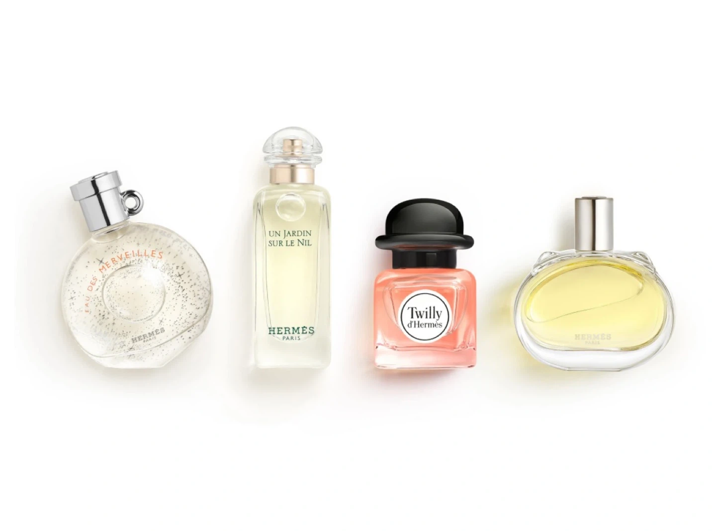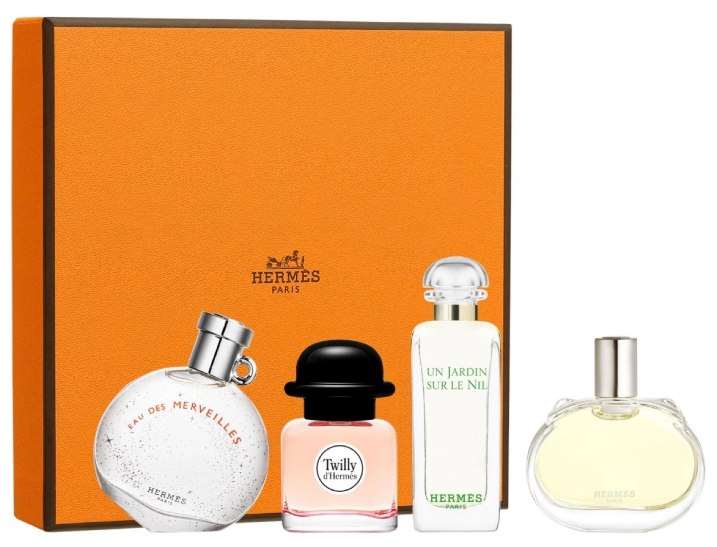 This Hermès discovery set features four miniature women's perfumes. It includes Twilly d'Hermès Eau de Parfum and others. Perfect for trying out different scents!