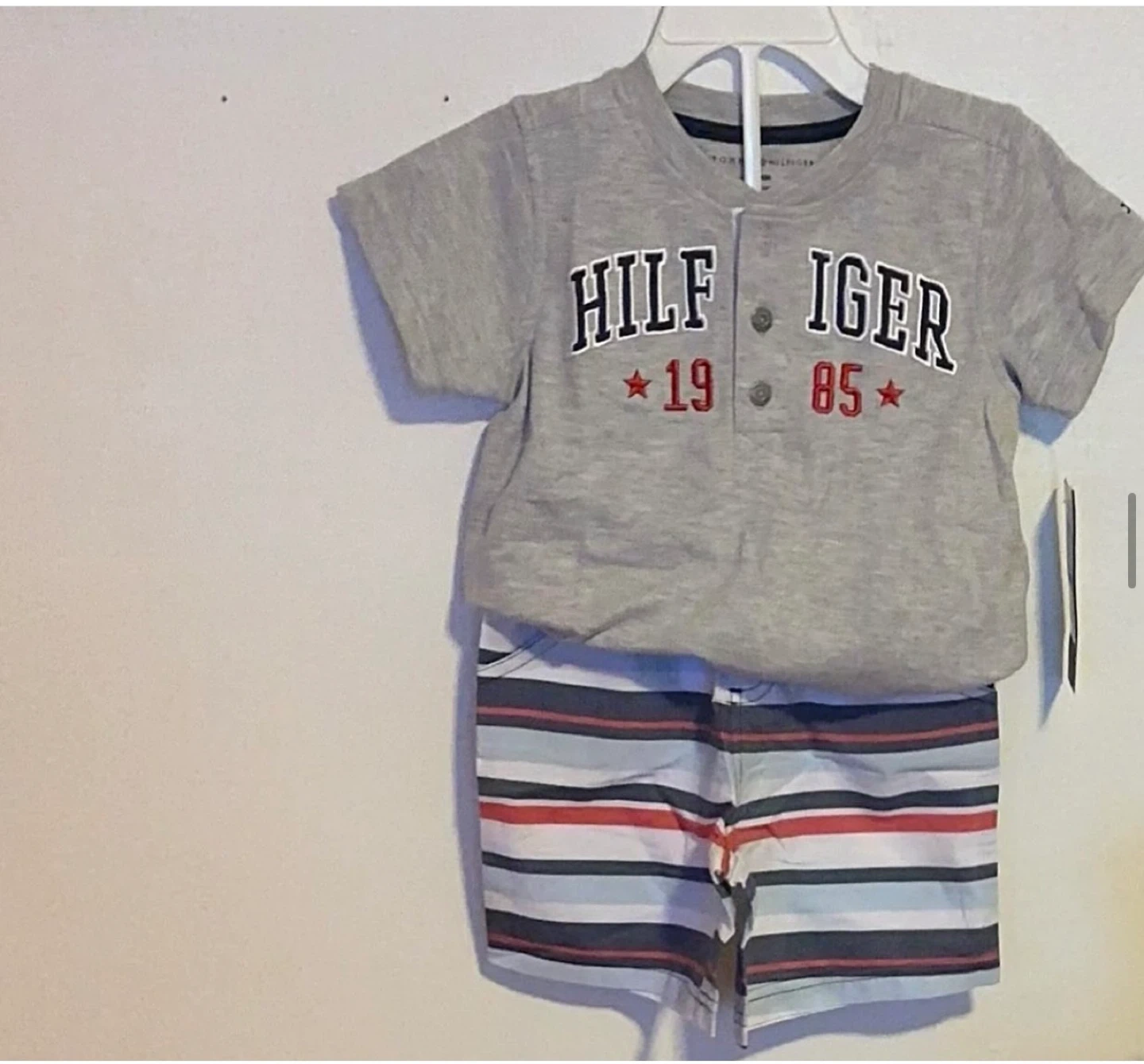 This adorable Tommy Hilfiger outfit, perfect for your little one, features a stylish grey t-shirt with the 'Hilfiger' logo and striped shorts. The material is soft and comfortable, ideal for all-day wear.