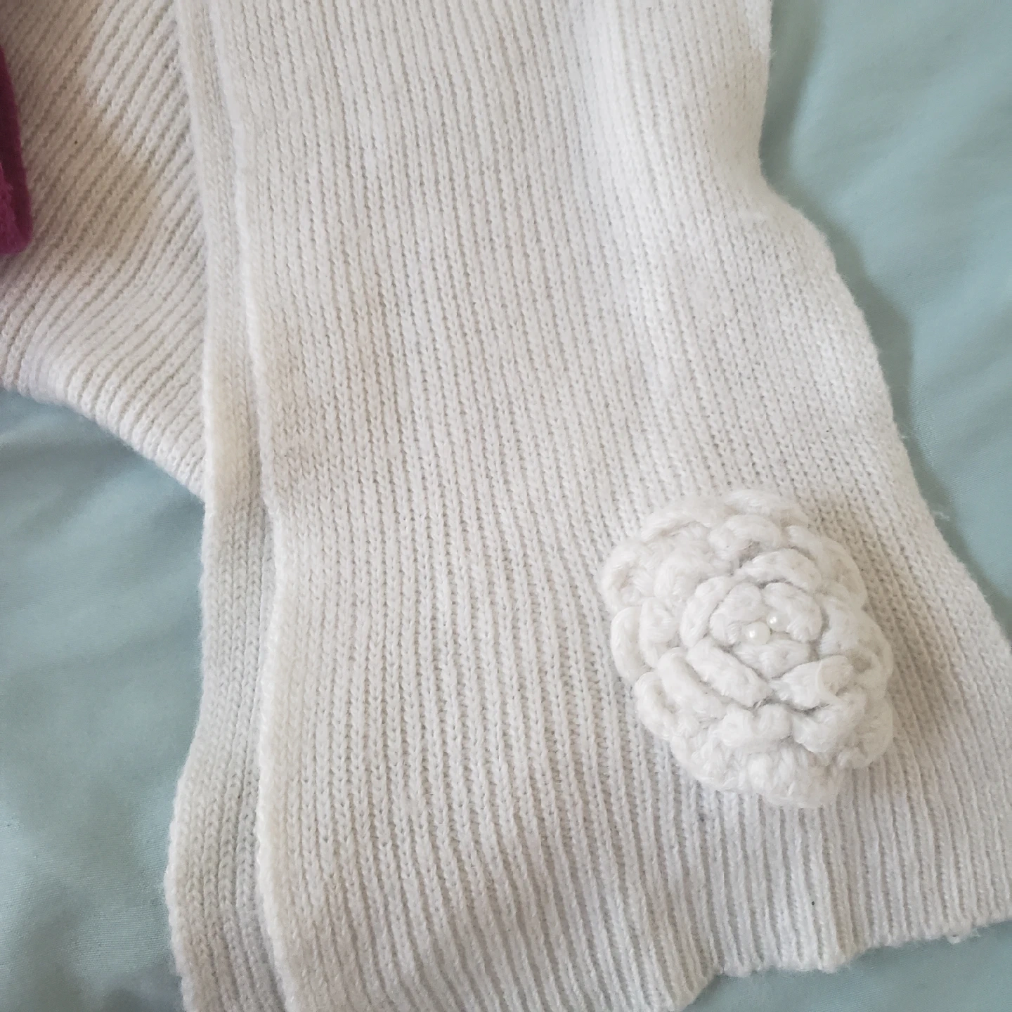 Two cozy scarves for sale! One is a vibrant pink knit, and the other is a cream-coloured knit scarf with a cute flower detail. Both are in great condition and ready to keep you warm this winter