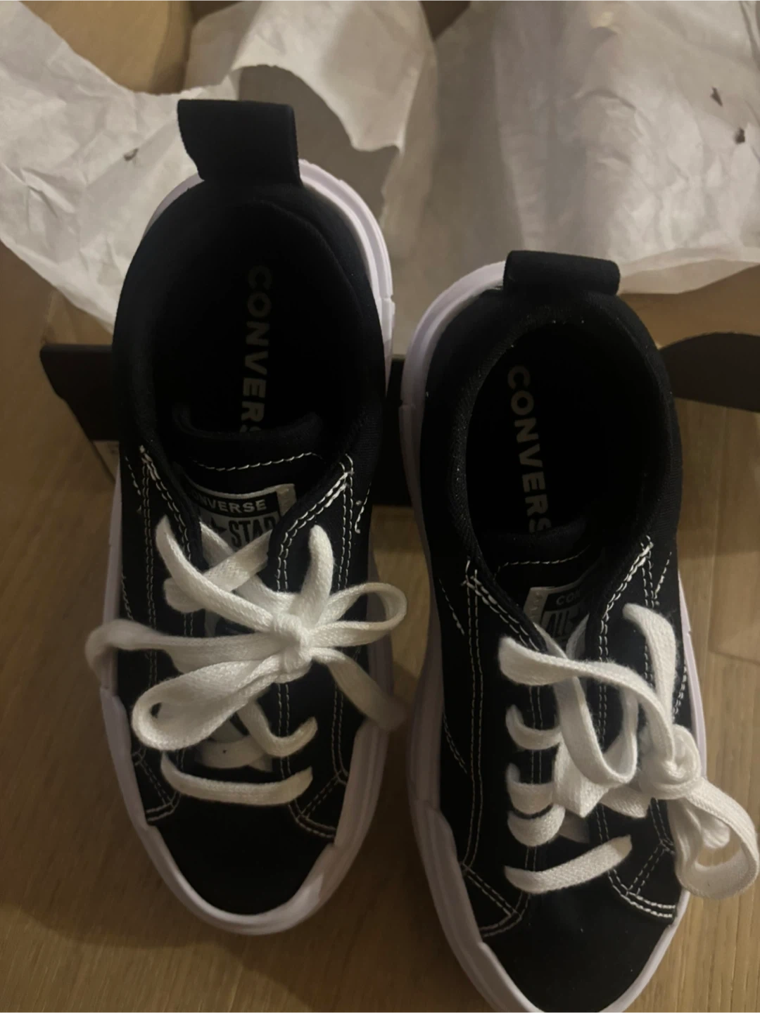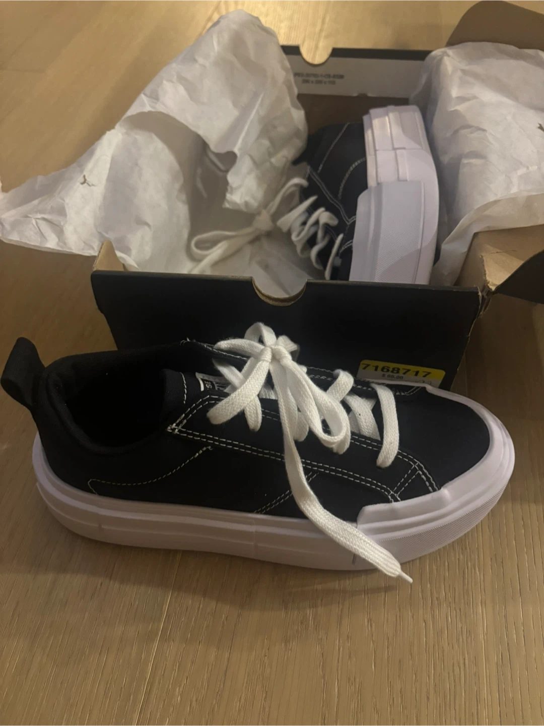 These are Converse sneakers in black and white. They're a kid's size 6 US what I bought to fit a ladies 7, but fit larger more of a ladies 8. Made with canvas material. Great for everyday wear! Brand new just delivered. Paid 65$