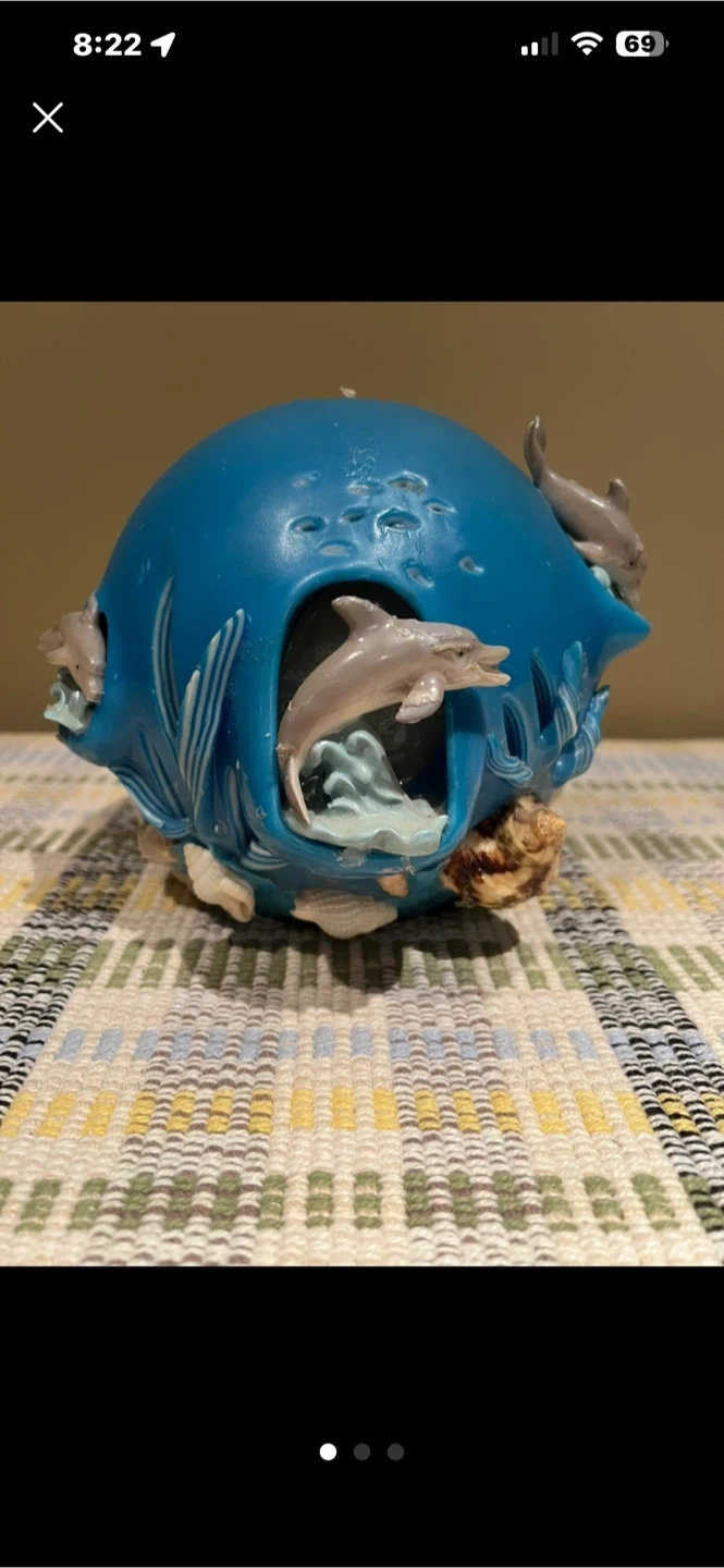 This decorative candle features a blue, orb-shaped design with dolphins and aquatic elements. It's a fun piece for any ocean lover.