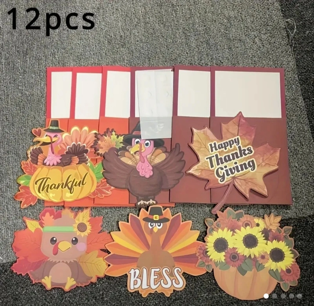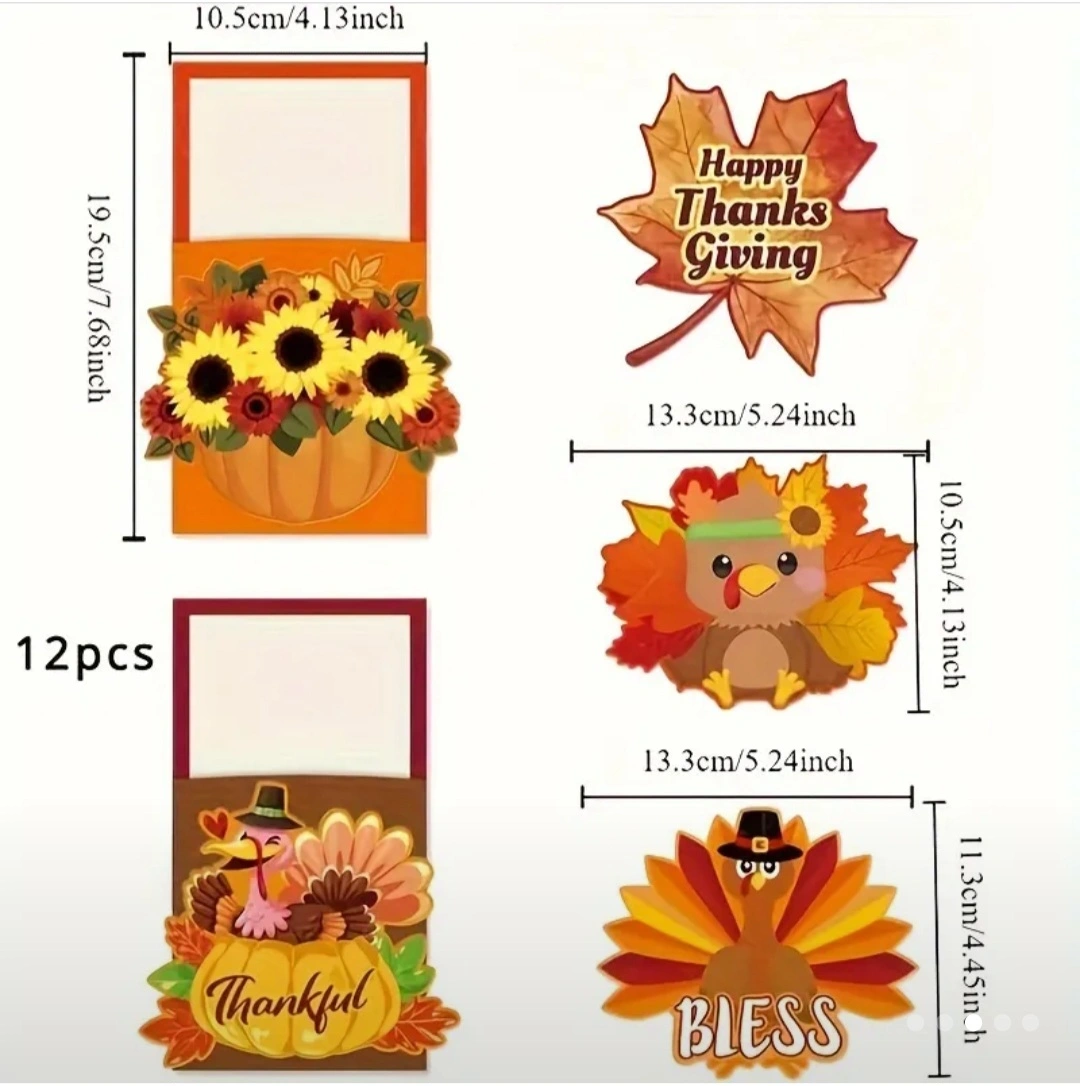 Get ready for Thanksgiving with these adorable place card holders! There are 12 pieces in total, featuring festive designs like turkeys, pumpkins, sunflowers, and maple leaves. They're perfect for adding a touch of autumn charm to your dinner table and making your guests feel extra special