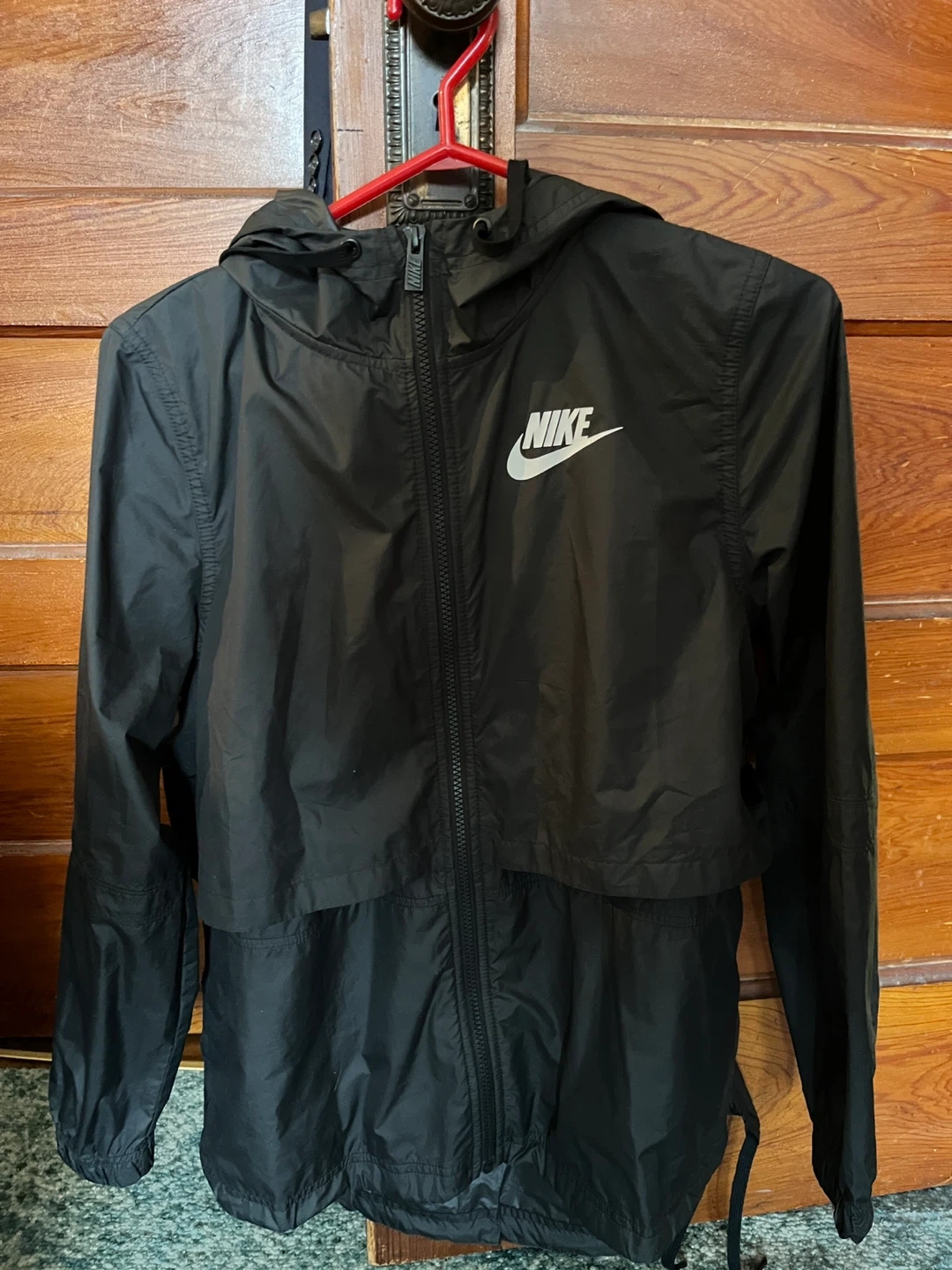 This is a black Nike hooded windbreaker jacket. It's made of lightweight material. A great jacket for everyday wear!