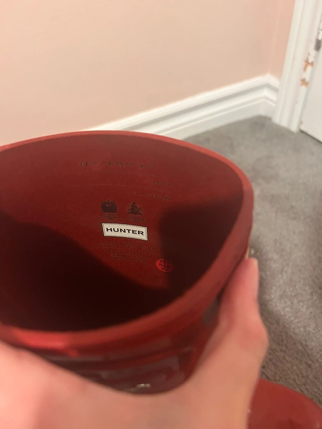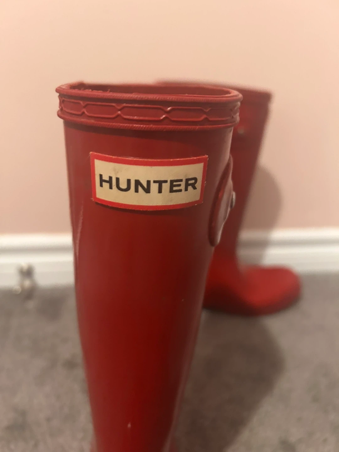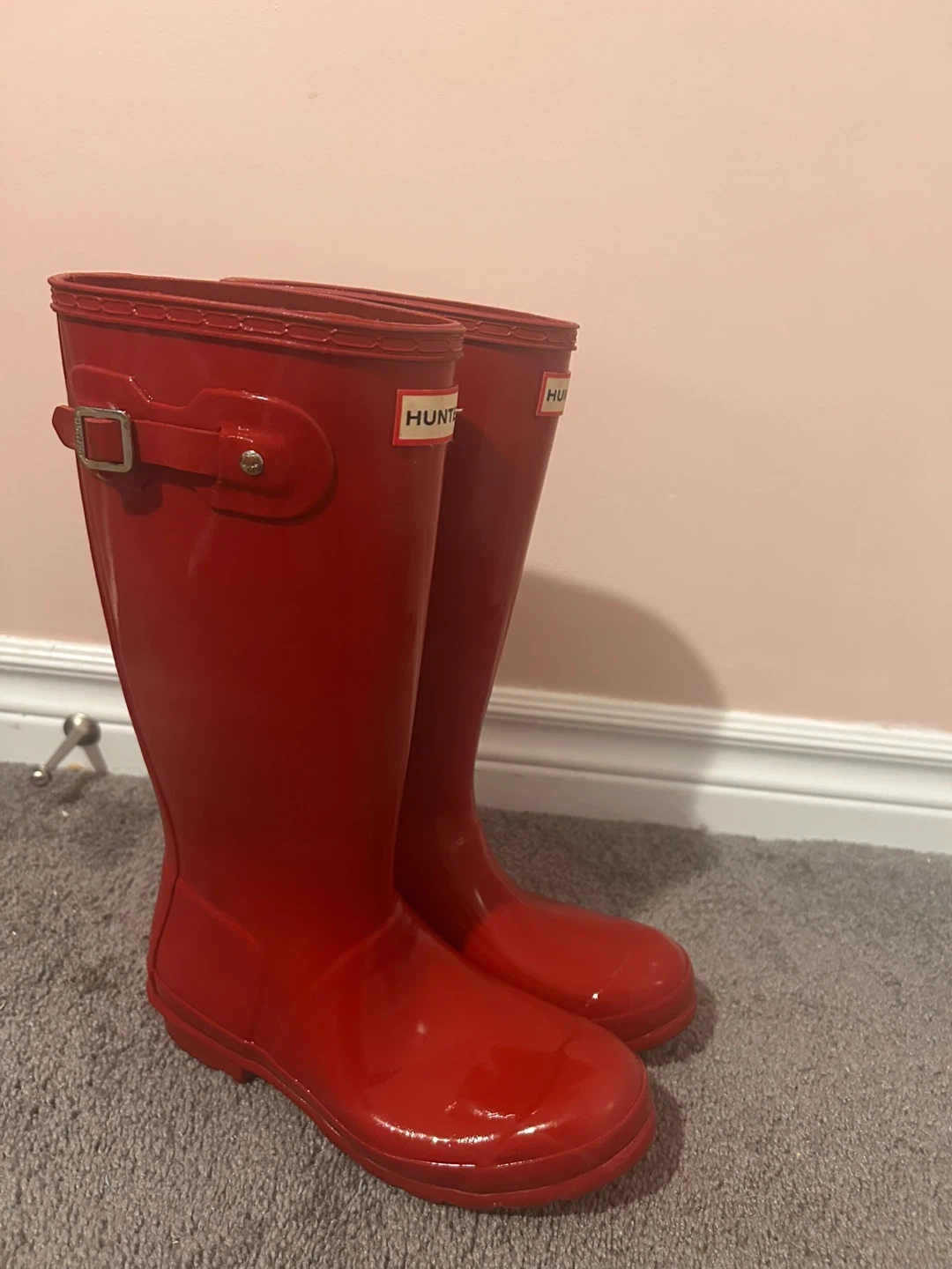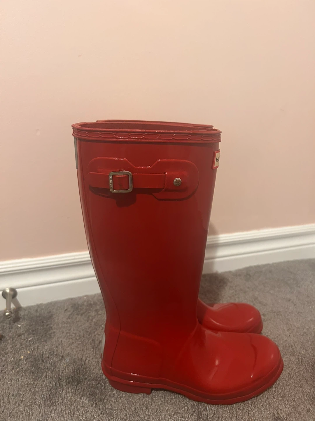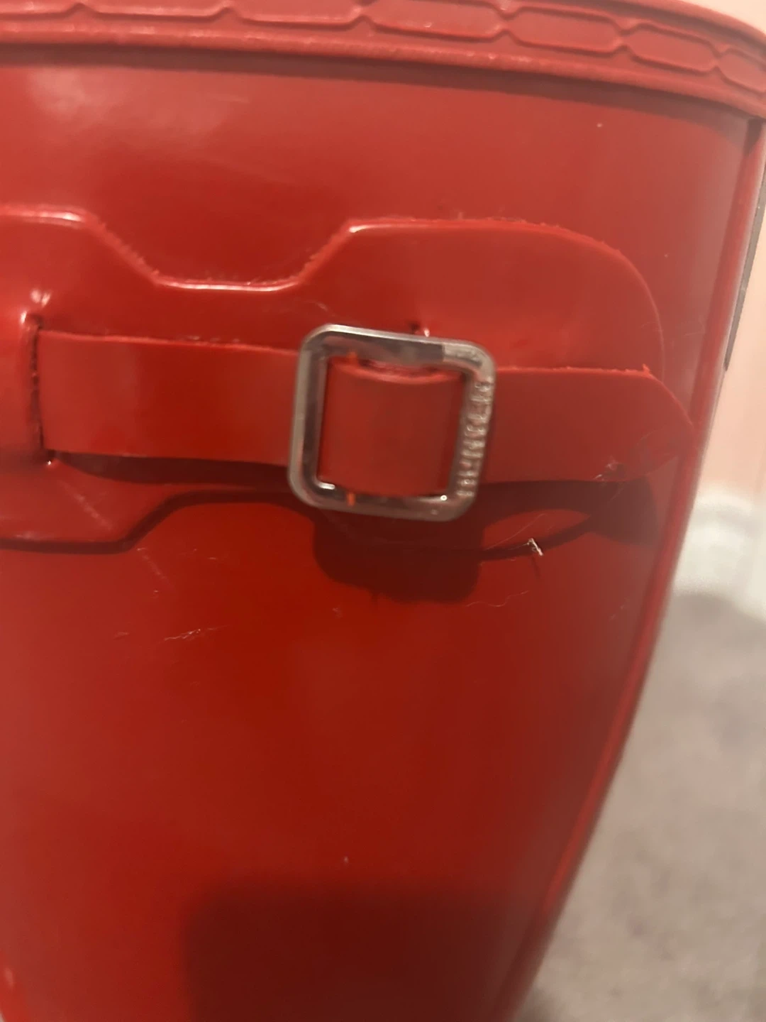Classic red Hunter rain boots. Tall style with adjustable buckle strap. Rubber construction for waterproof wear. Perfect for rainy days!