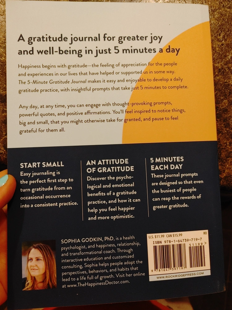 Looking to add a little positivity to your day? I'm selling The 5-Minute Gratitude Journal by Sophia Godkin, PhD! It's designed to help you cultivate gratitude with insightful prompts that take just 5 minutes to complete. Originally bought for $15.99, this journal is perfect for anyone looking to start a daily gratitude practice and reap the rewards of greater happiness