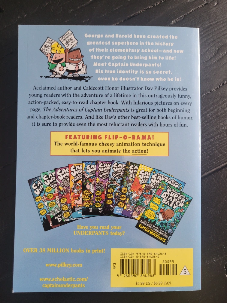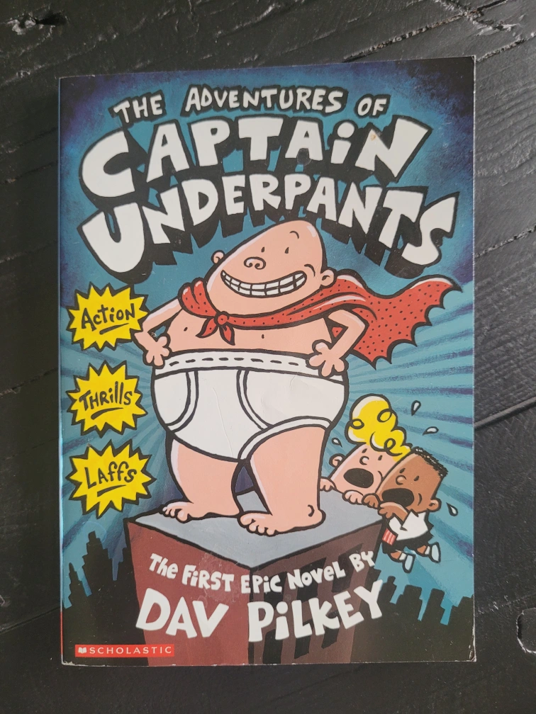 Selling The Adventures of Captain Underpants! It's the first epic novel by Dav Pilkey. This book is full of action, thrills, and laffs. It also features flip-o-rama, a world-famous cheesy animation technique that lets you animate the action!