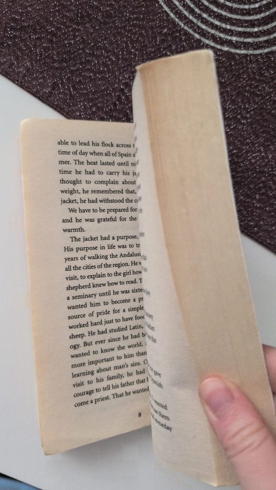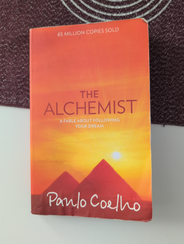 giving away an orgionicopy of 'The Alchemist' by Paulo Coelho! some moisture damage on the lower edge from water but there is no staining or fraying of the binding just some warping in the paper