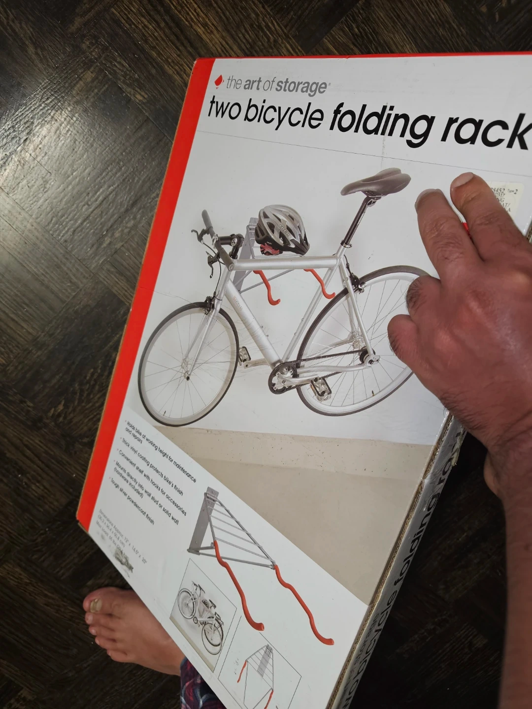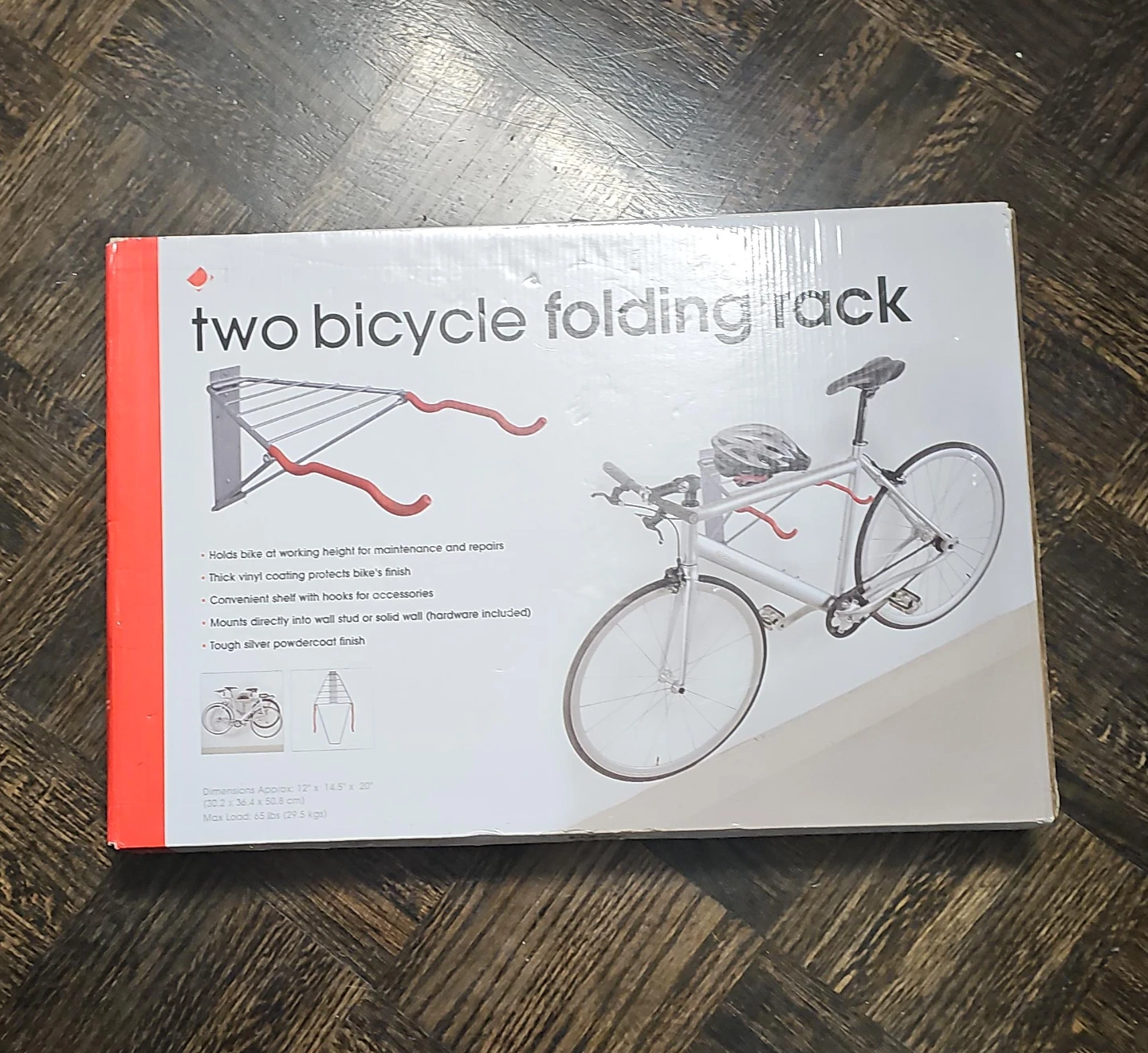 60Selling a 'The Art of Storage' two bicycle folding rack. It's designed to hold your bike at a working height for maintenance and repairs. The rack features a thick vinyl coating to protect your bike's finish, and it comes with convenient shelf hooks for accessories. It mounts directly into a wall stud or solid wall with included hardware. The finish is a tough, durable powder coat. Dimensions are approximately 12" x 14.5" x 20" (30.2 x 36.4 x 50.8 cm) and the max load is 65 lbs (29.5 kgs). Box included