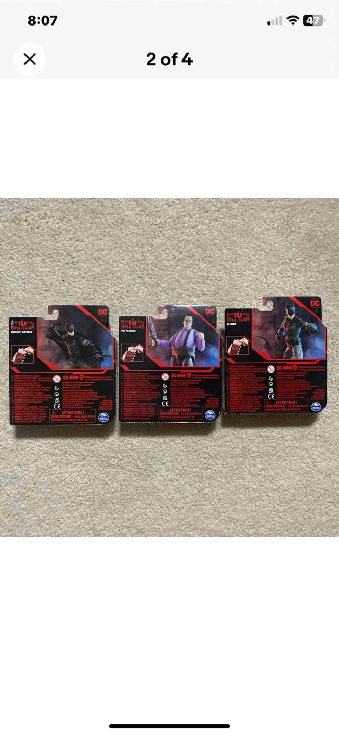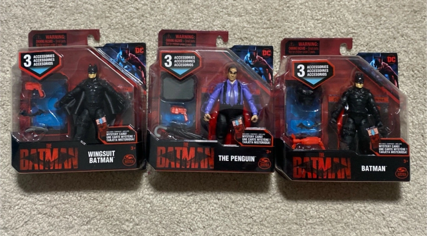 Selling a set of three action figures from The Batman movie! Includes Batman, Wingsuit Batman, and The Penguin. Each figure comes with 3 accessories and a mystery card. Recommended for ages 3+ Pickup in Wasaga Beach