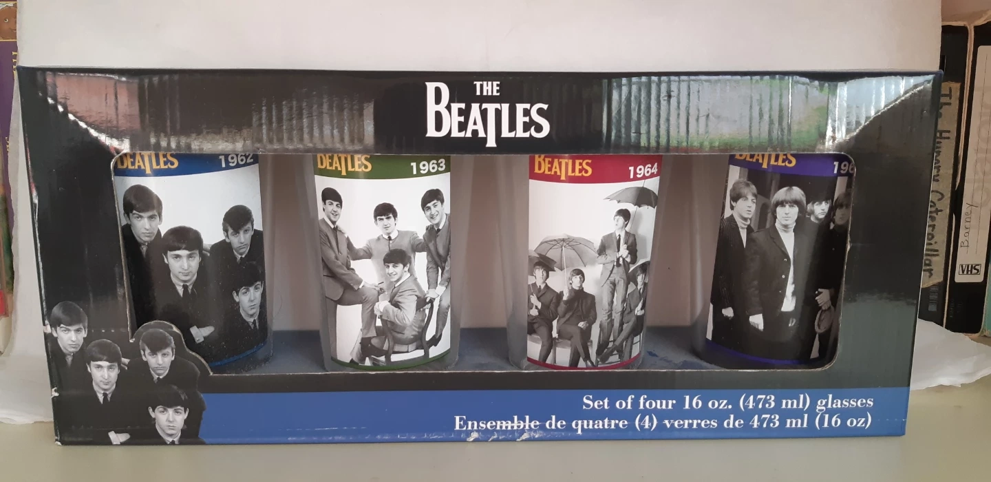 848NEW....STILL IN THE BOX! Here's a great set of four glasses featuring images of the Fab Four from 1962, 1963, 1964 and 1965! Each glass holds 16 oz (473 ml). A perfect gift for any Beatles fan!