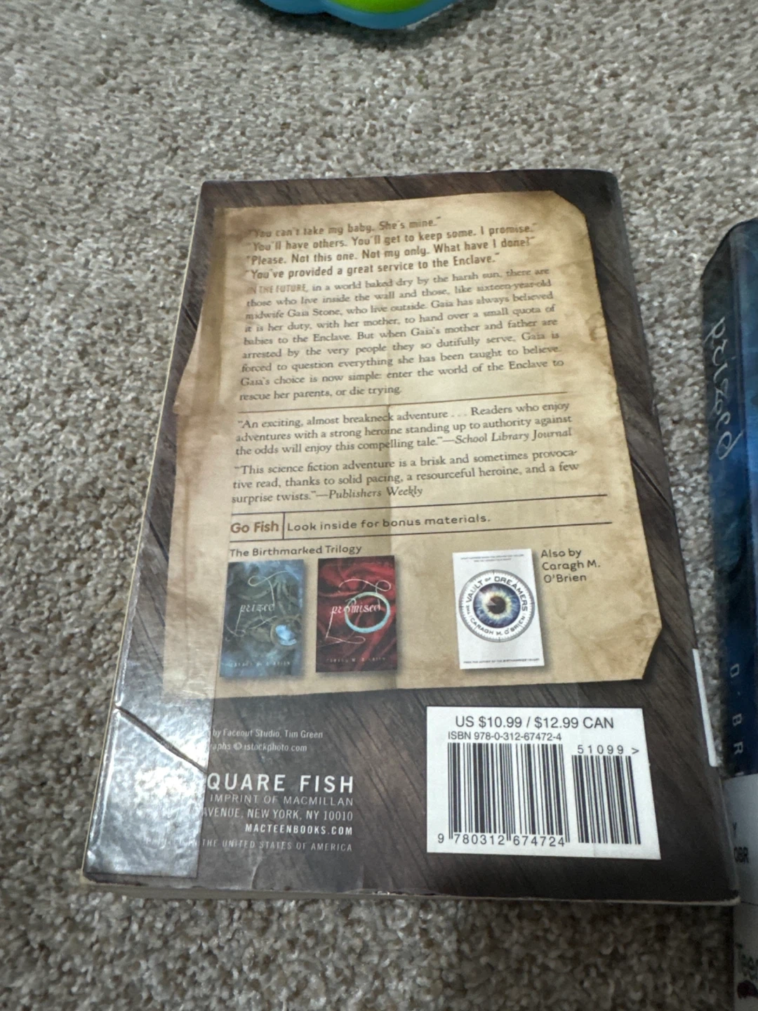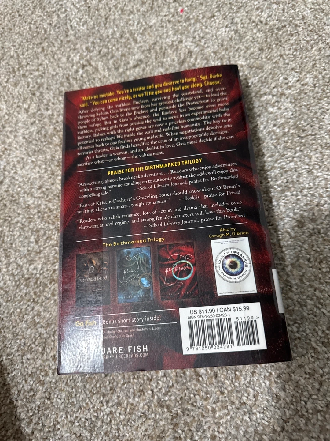 102THE BOOKS WERE FROM THE LIBRARY BUT I BOUGHT THEM: Selling the complete Birthmarked Trilogy by Caragh M. O'Brien! This series includes Birthmarked, Prized, and Promised. A great read for anyone who enjoys dystopian fiction!